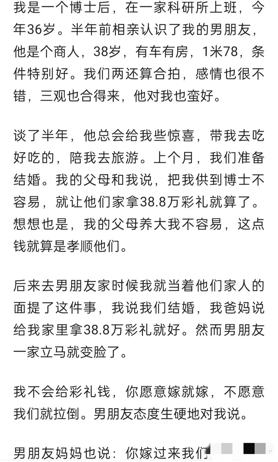 男方估计是气愤女博士居然不跟他先通个气,见了男方父母就提38.8万彩礼。换作我是男方也怒了!彩礼这种婚俗不知道拆散多少姻缘了