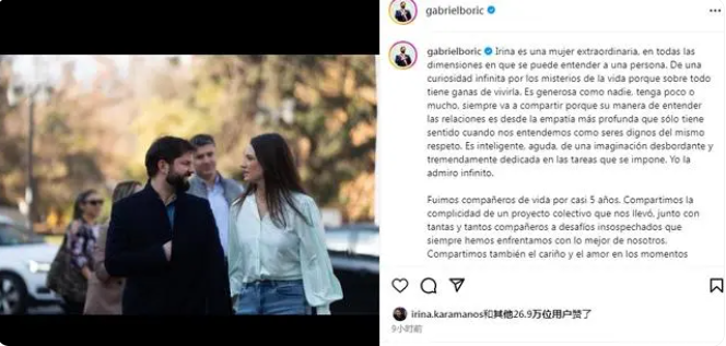 大瓜!智力总统博里奇和第一夫人分手了!智力总统博里奇发文表示由于我们对未来的看法