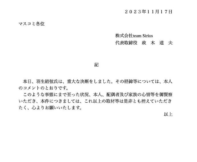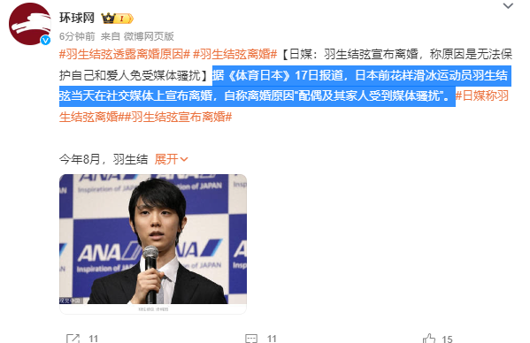 据《体育日本》17日报道,日本前花样滑冰运动员羽生结弦当天在社交媒体上宣布离婚,自称离婚原因“配偶及其家人受到媒体骚扰”。女方甚至没办法离开家门一步,为了对方的幸福着想,遂决定离婚。
