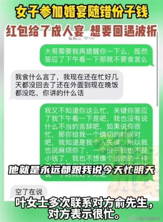其次,本案比较特殊,叶女士是给朋友随份子,误将红包给了其他人。