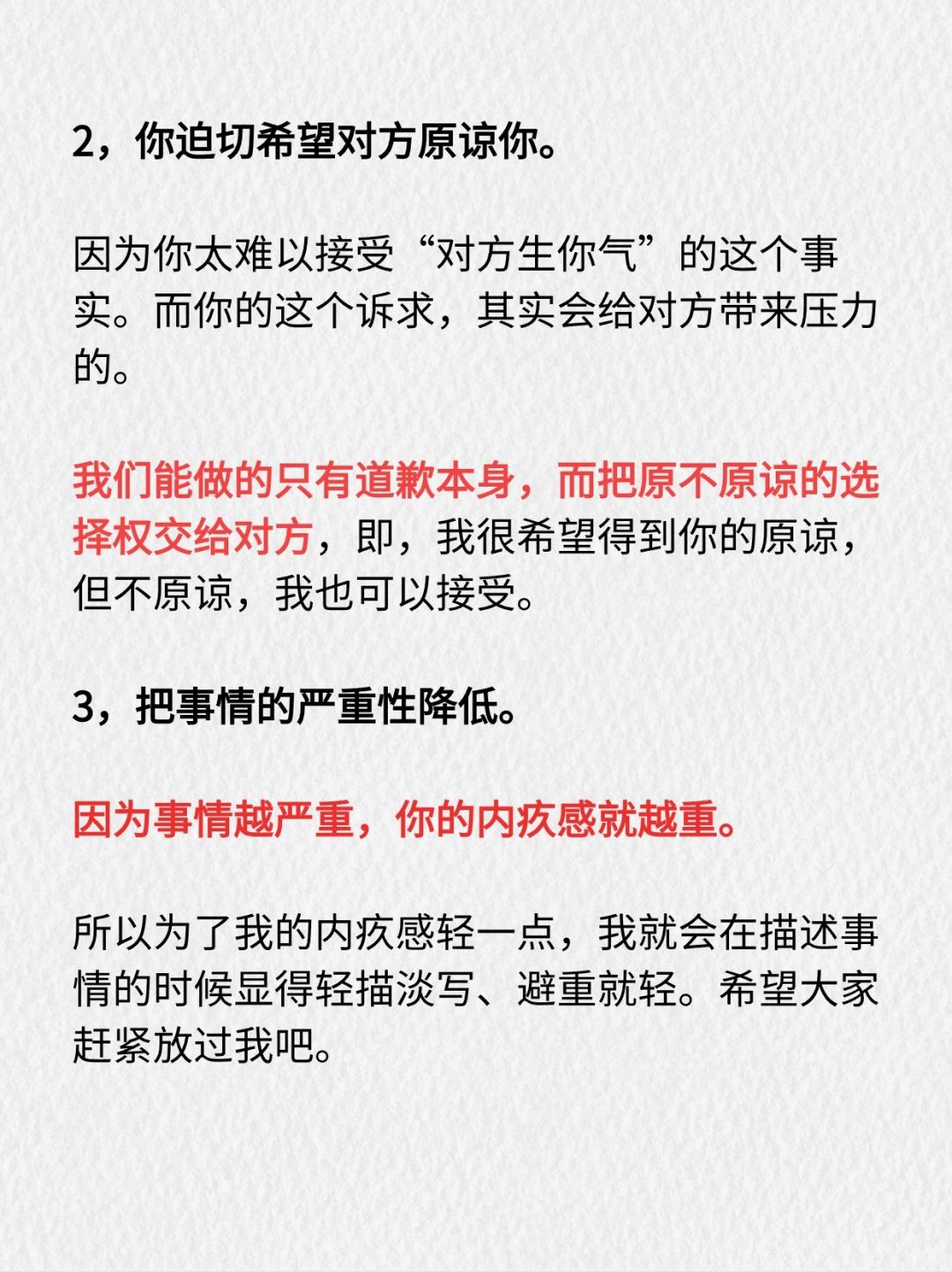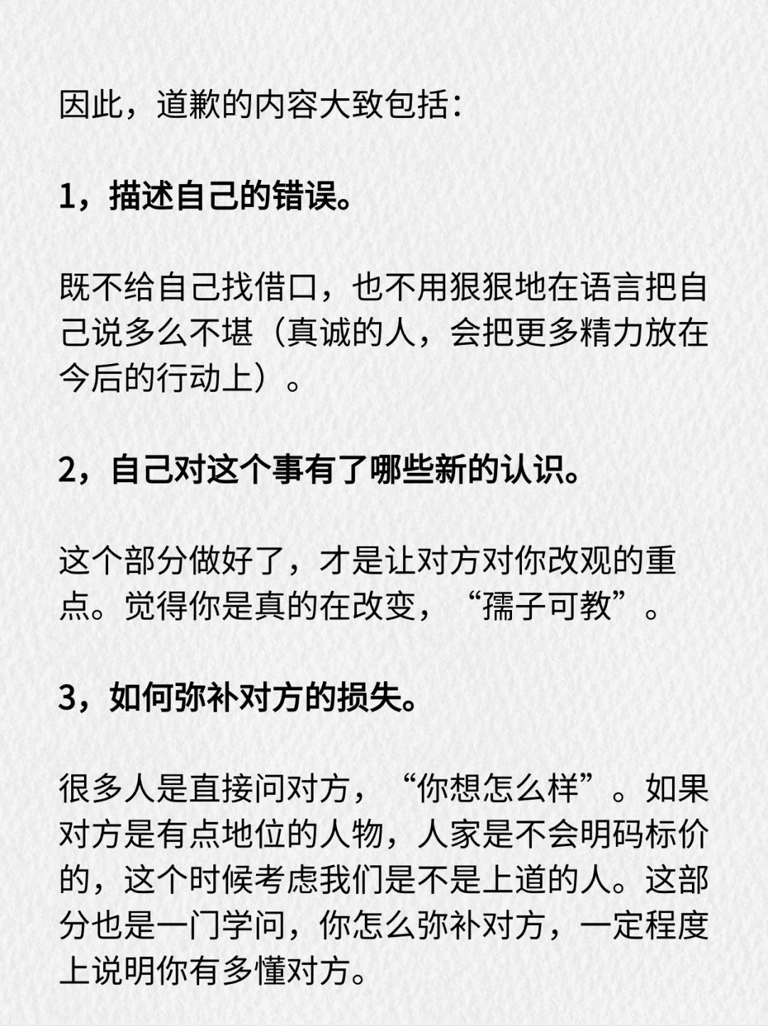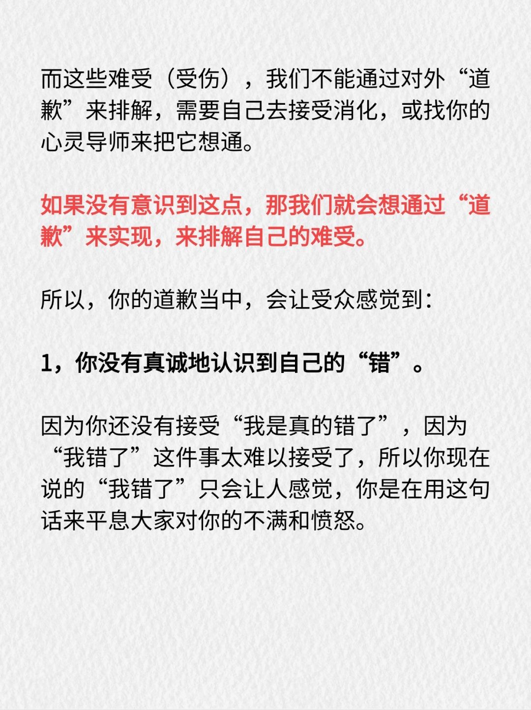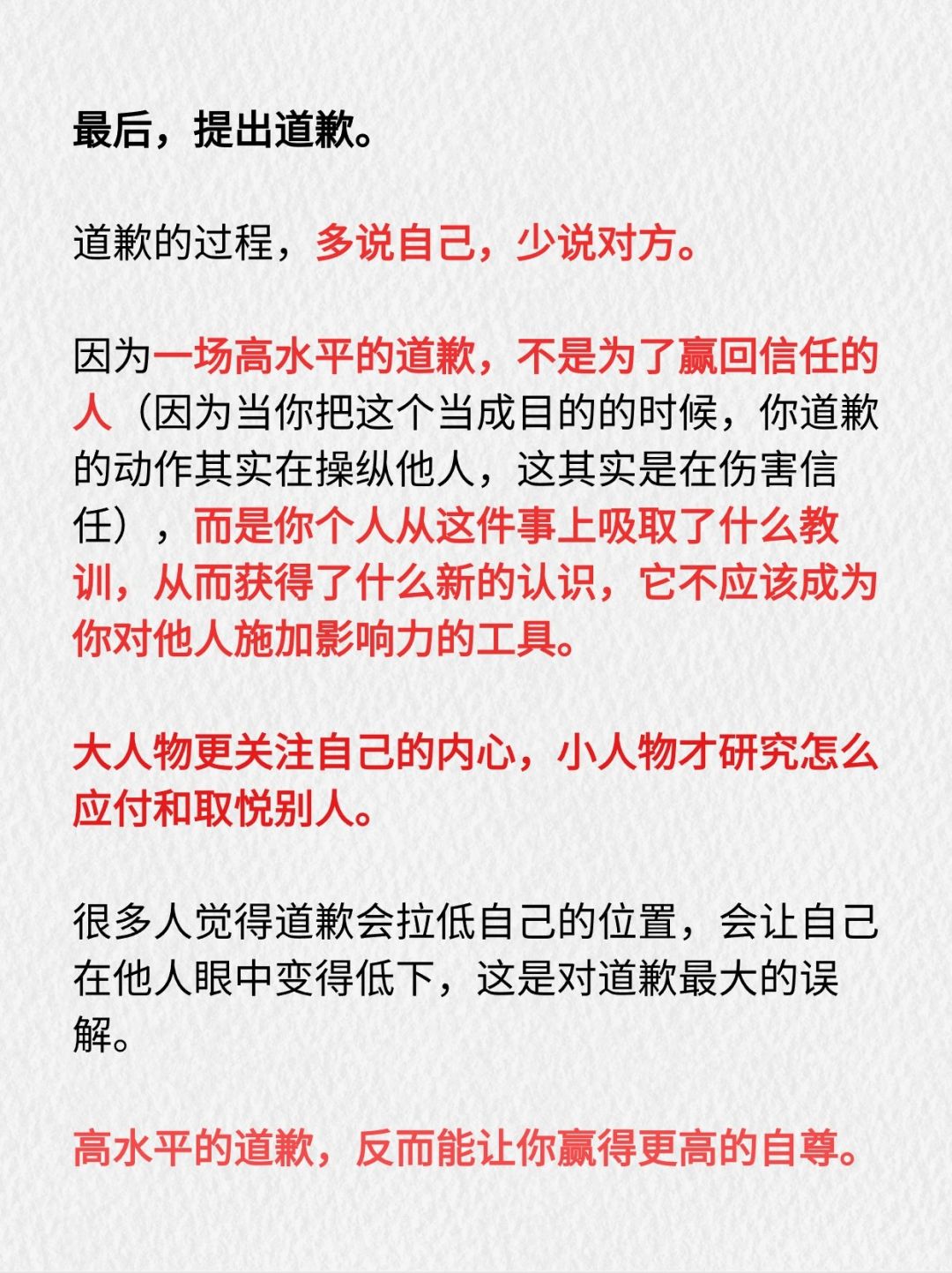 因为一场高水平的道歉,不是为了赢回信任的人,而是你个人从这件事上吸取了什么教训,从而获得了什么新的认识,它不应该成为你对他人施加影响力的工具。