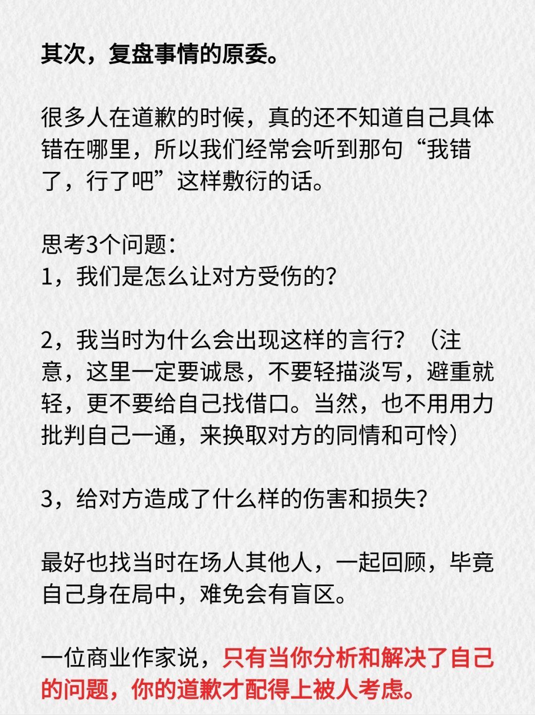 很多人在道歉的时候,真的还不知道自己具体错在哪里,所以我们经常会听到那句“我错了行了吧”这样敷衍。