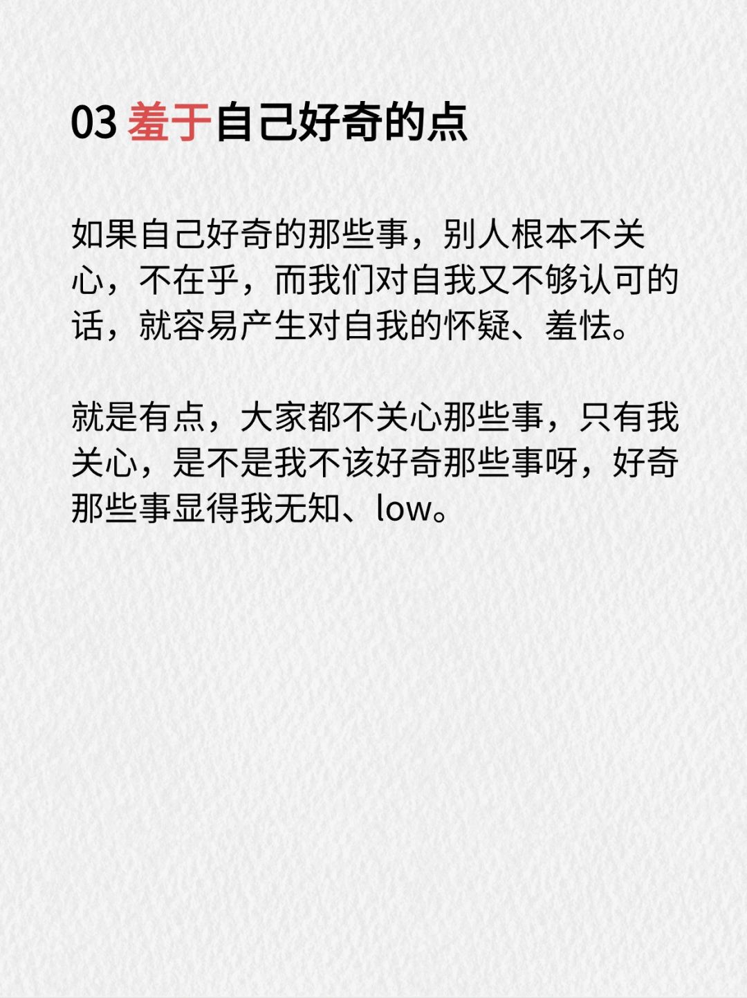 如果自己好奇的那些事,别人根本不关心,不在乎,而我们对自我又不够认可的话,就容易产生对自我的怀疑、羞怯。