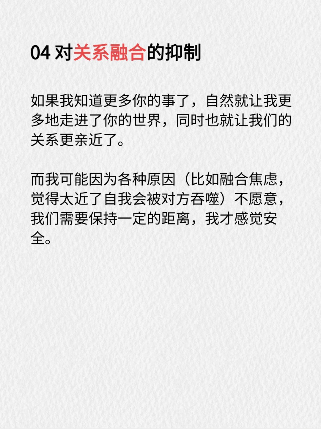 而我可能因为各种原因(比如融合焦虑,觉得太近了自我会被对方吞噬)不愿意,我们需要保持一定的距离,我才感觉安全。