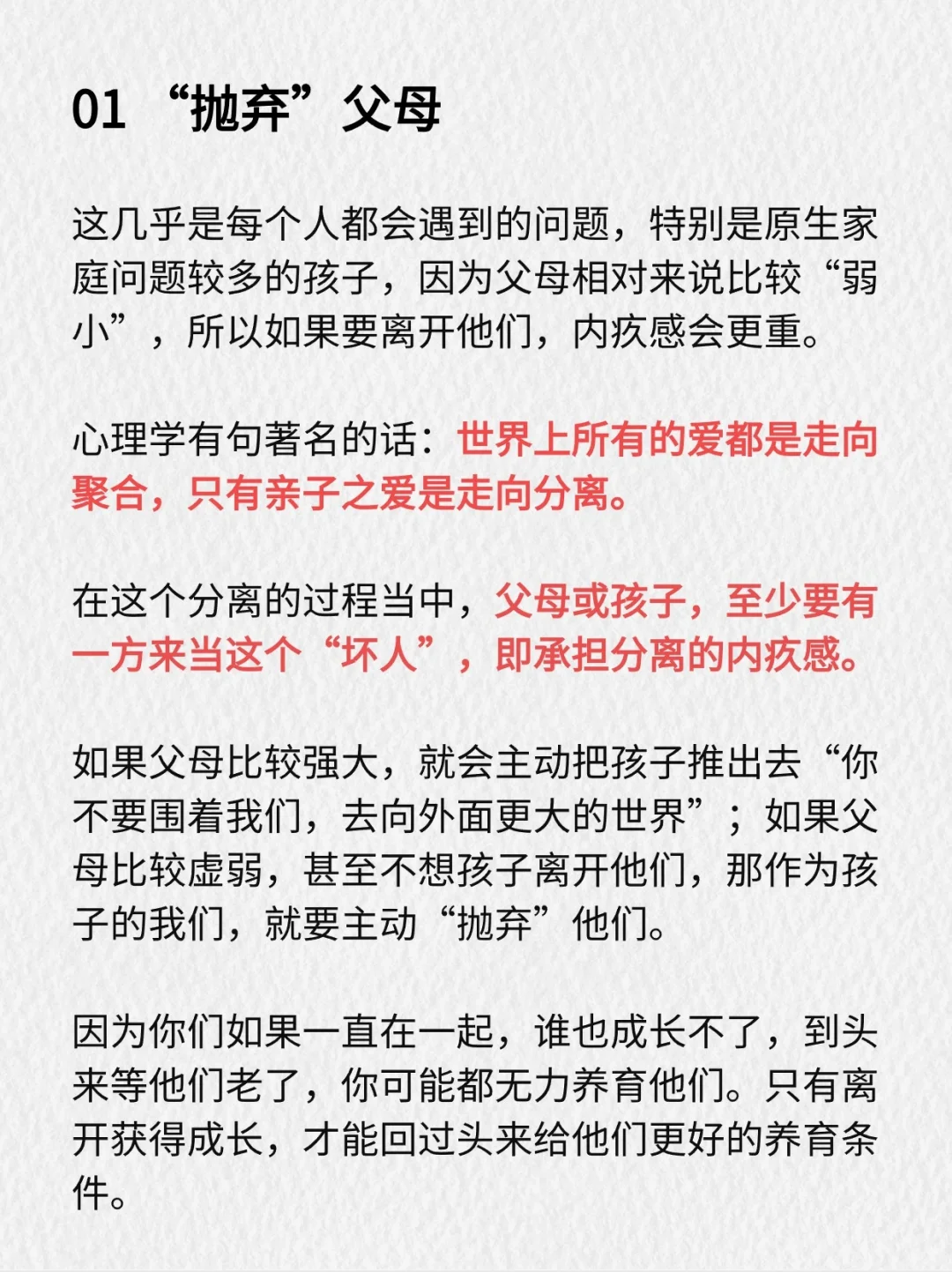 如果父母比较强大,就会主动把孩子推出去“你不要围着我们,去向外面更大的世界”;如果父母比较虚弱,甚至不想孩子离开他们,那作为孩子的我们,就要主动“抛弃”他们。