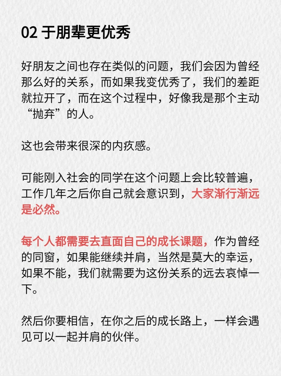 好朋友之间也存在类似的问题,我们会因为曾经那么好的关系,而如果我变优秀了,我们的差距就拉开了,而在这个过程中,好像我是那个主动“抛弃”的人。