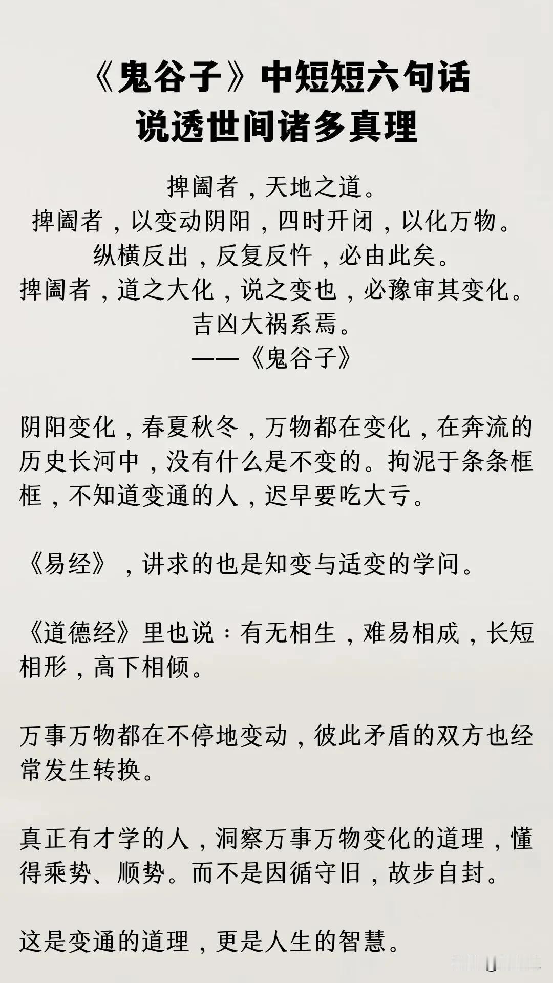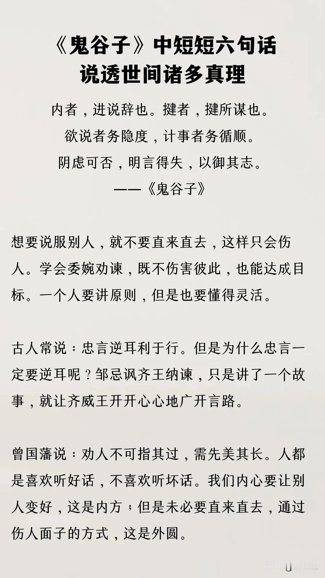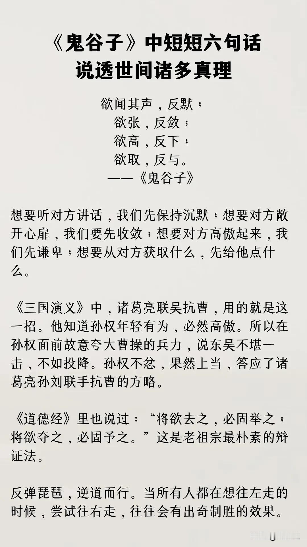 《鬼谷子》中短短六句话,说透世间诸多真理。比如,第二句欲闻其声,反默;欲张,反敛;欲高,反下;欲取,反与。告诉我们想要听对方讲话,我们先保持沉默;想要对方敞开心扉,我们要先收敛;想要对方高傲起来,我们先谦卑;想要从对方获取什么,先给他点什么。这六句话,建议大家保存下来,没事拿出来多品一品这六句话,能悟透其中的道理,对于以后的生活还是工作都很有帮助,能少走很多弯路。 #实话实说# 漫画版鬼谷子全套6册
