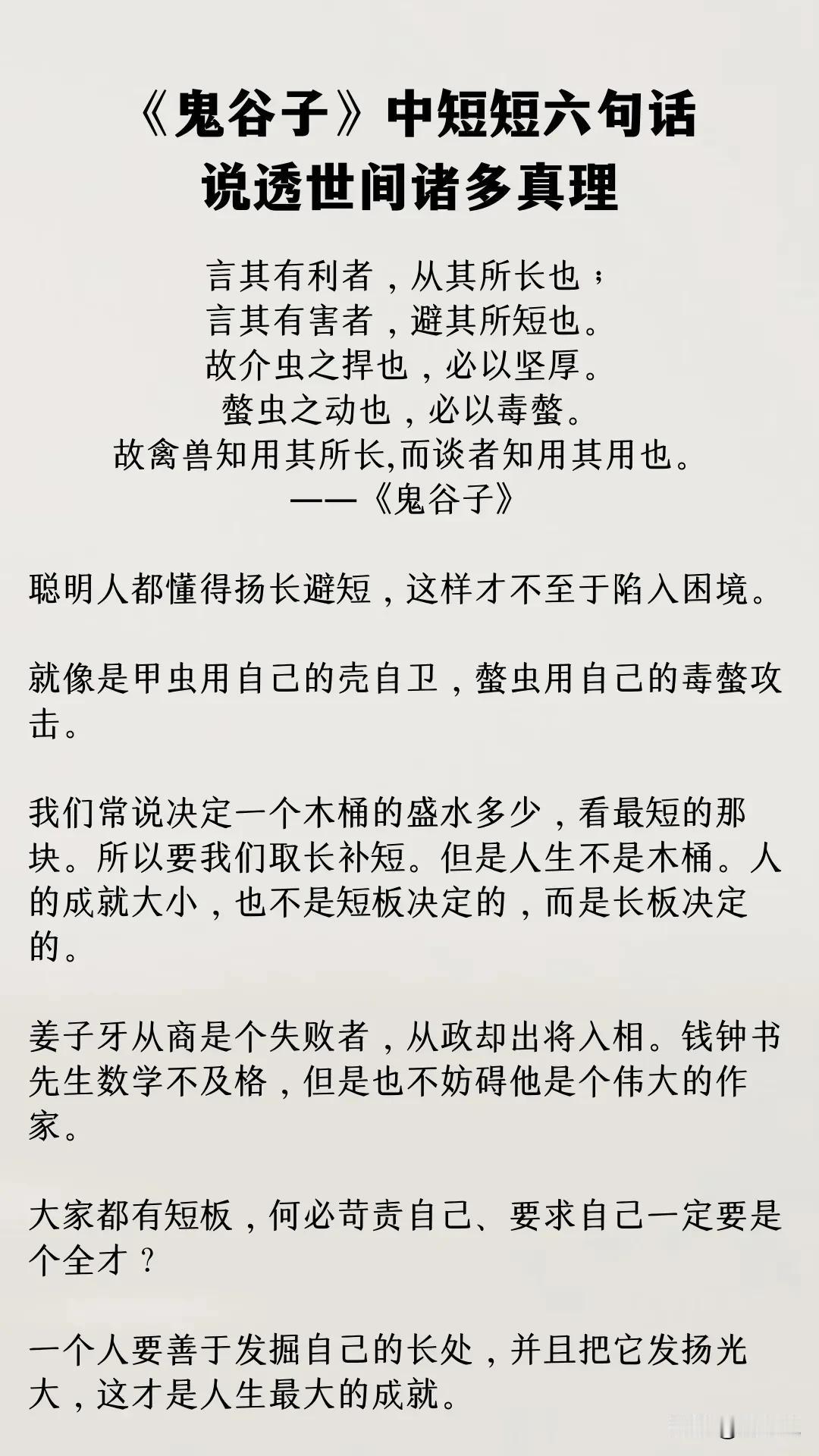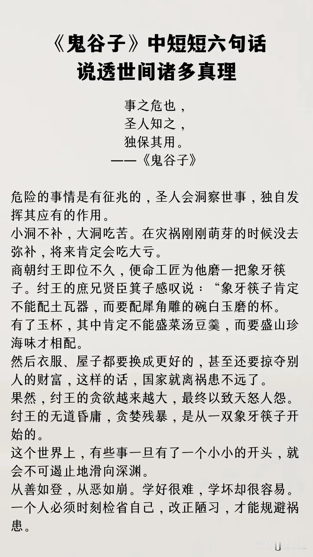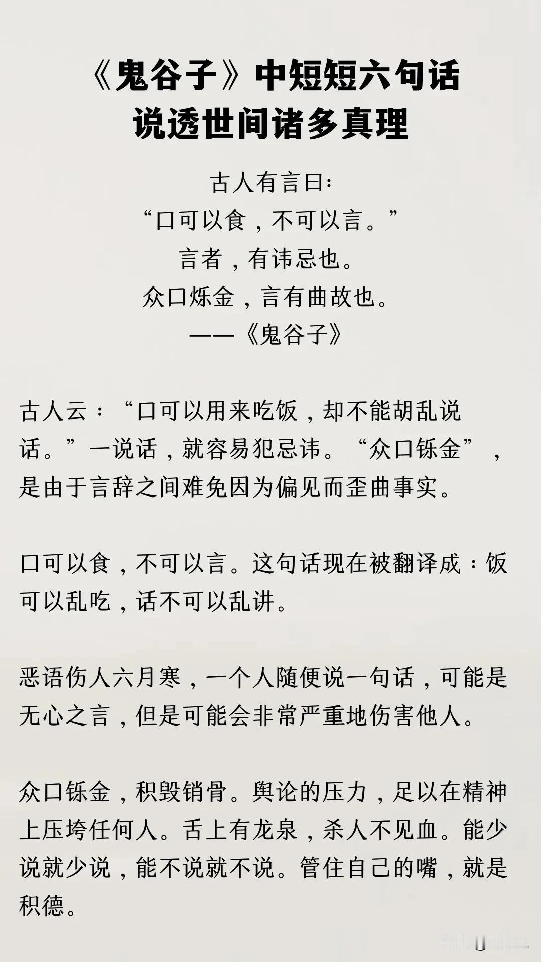 《鬼谷子》中短短六句话,说透世间诸多真理。比如,第二句欲闻其声,反默;欲张,反敛;欲高,反下;欲取,反与。告诉我们想要听对方讲话,我们先保持沉默;想要对方敞开心扉,我们要先收敛;想要对方高傲起来,我们先谦卑;想要从对方获取什么,先给他点什么。这六句话,建议大家保存下来,没事拿出来多品一品这六句话,能悟透其中的道理,对于以后的生活还是工作都很有帮助,能少走很多弯路。 #实话实说# 漫画版鬼谷子全套6册