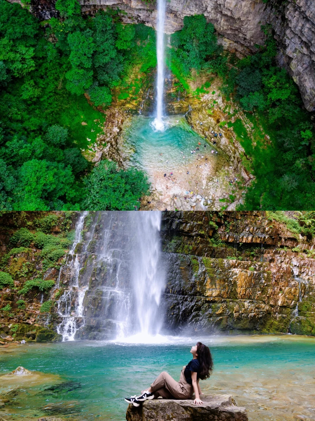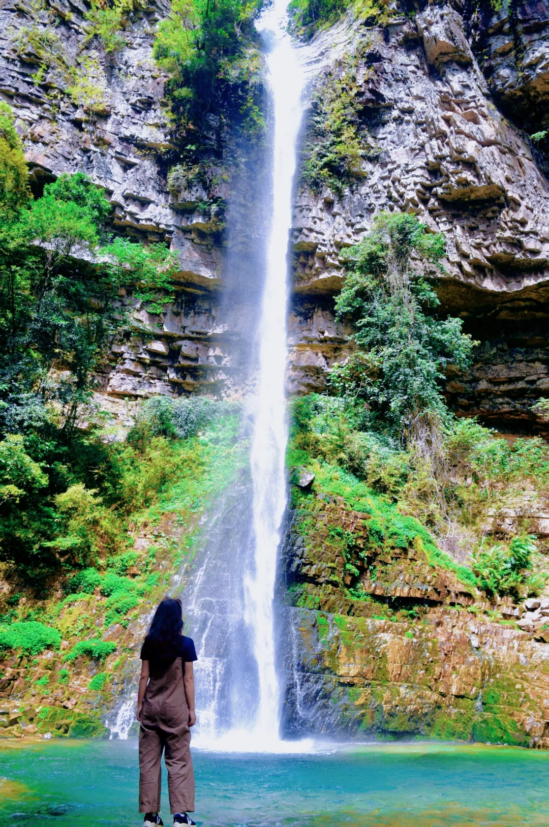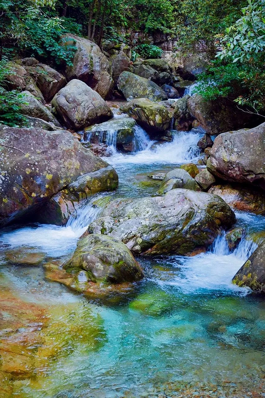 溪流的尽头是五龙飞瀑,这里虽然没有银河落九天的磅礴,但也有“飞流直下三千尺”的气势,倾泻而下的山水,在潭底溅起层层波,荡起阵阵雾。潭水湛蓝得清澈见底,宛如蓝宝石一般在阳光下闪烁着波光。