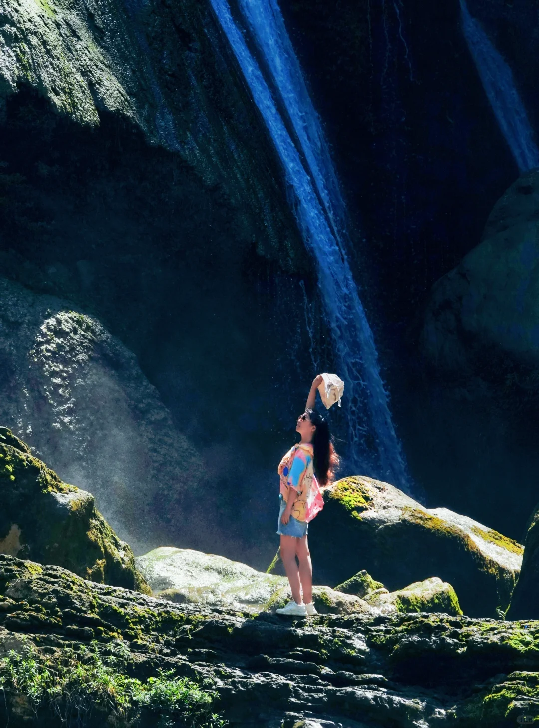 穿过瀑布后面的石洞通道,清爽冰凉的水汽扑面而来,洞壁葱笼,苔衣茸茸。人从洞中过,水在洞顶流,水声如雷滚天际,像虎啸深谷