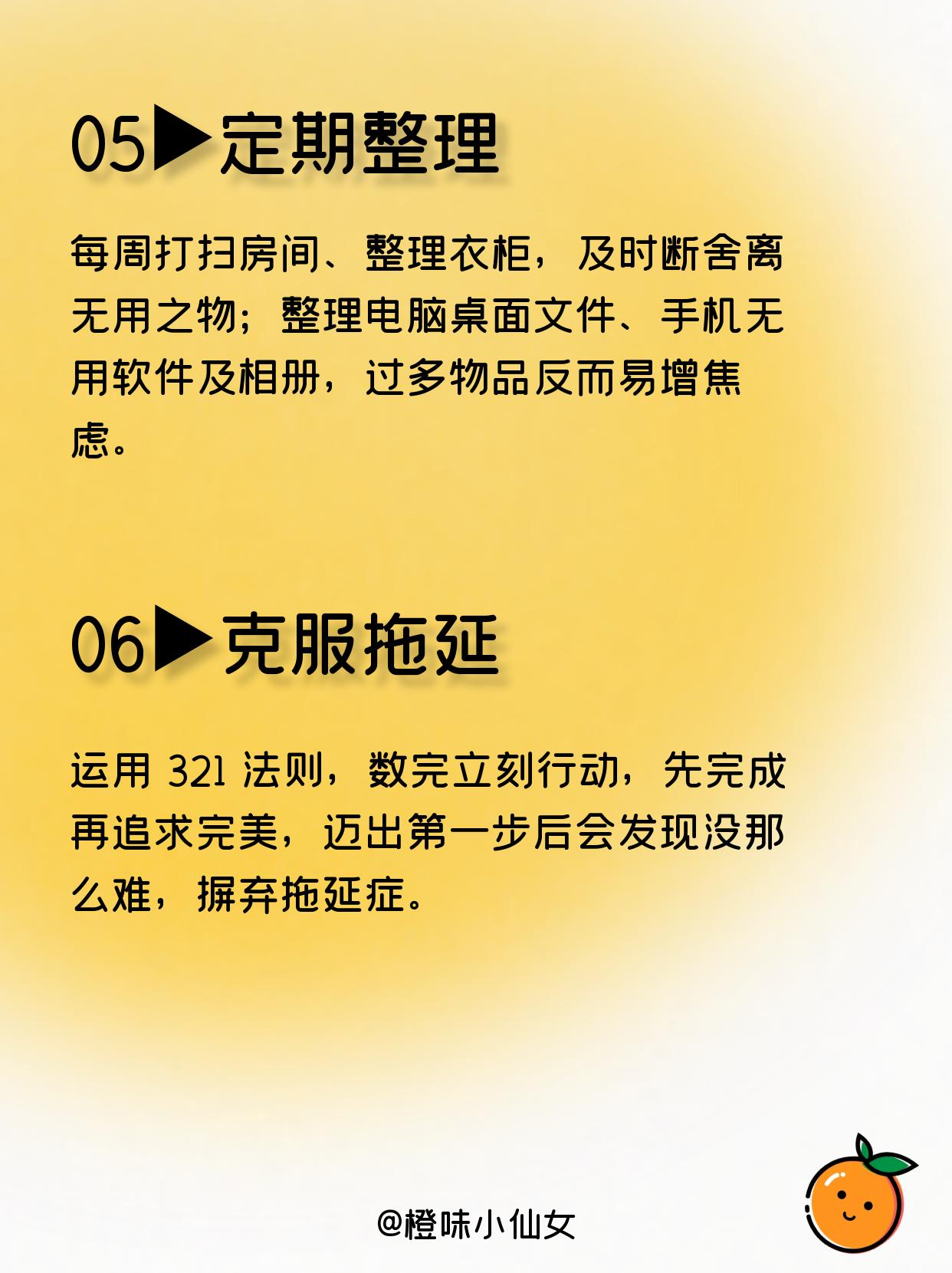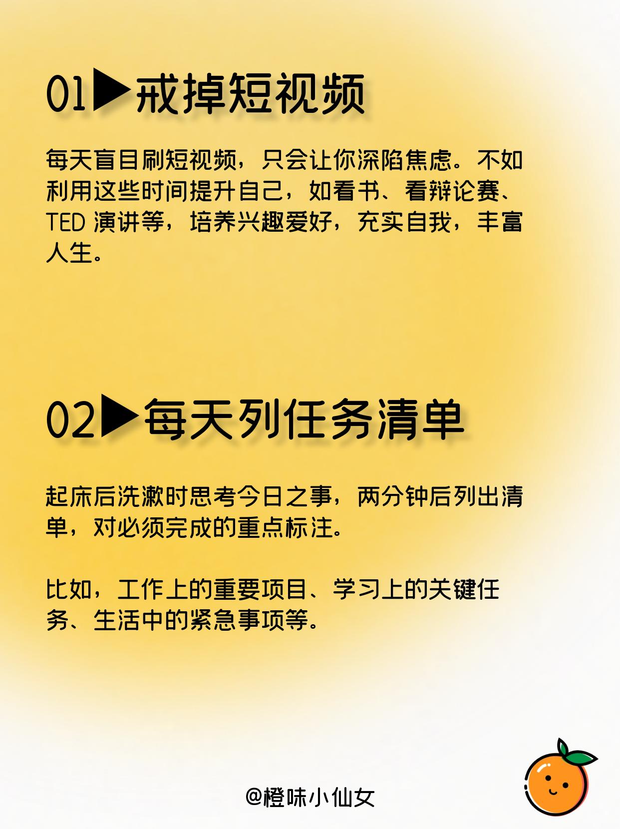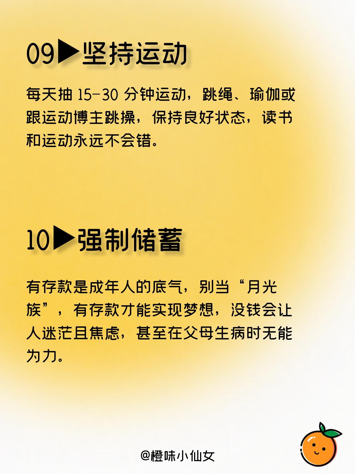 优秀的女生,都在坚持这10个微习惯。生活中,我们要学会定期整理,摒弃无用之物; 克服拖延,立即行动;调整好心态,乐观面对生活; 积极体验新事物,拓宽视野和思维; 坚持运动,保持良好状态; 还要强制储蓄,有存款才有底气。 做到这些,我们能让自己变得更优秀, 减少焦虑,拥有更美好的人生。 同时,要明白读书和运动是永远值得去做的两件事, 不要当“月光族”,要为自己的未来做好规划和准备。