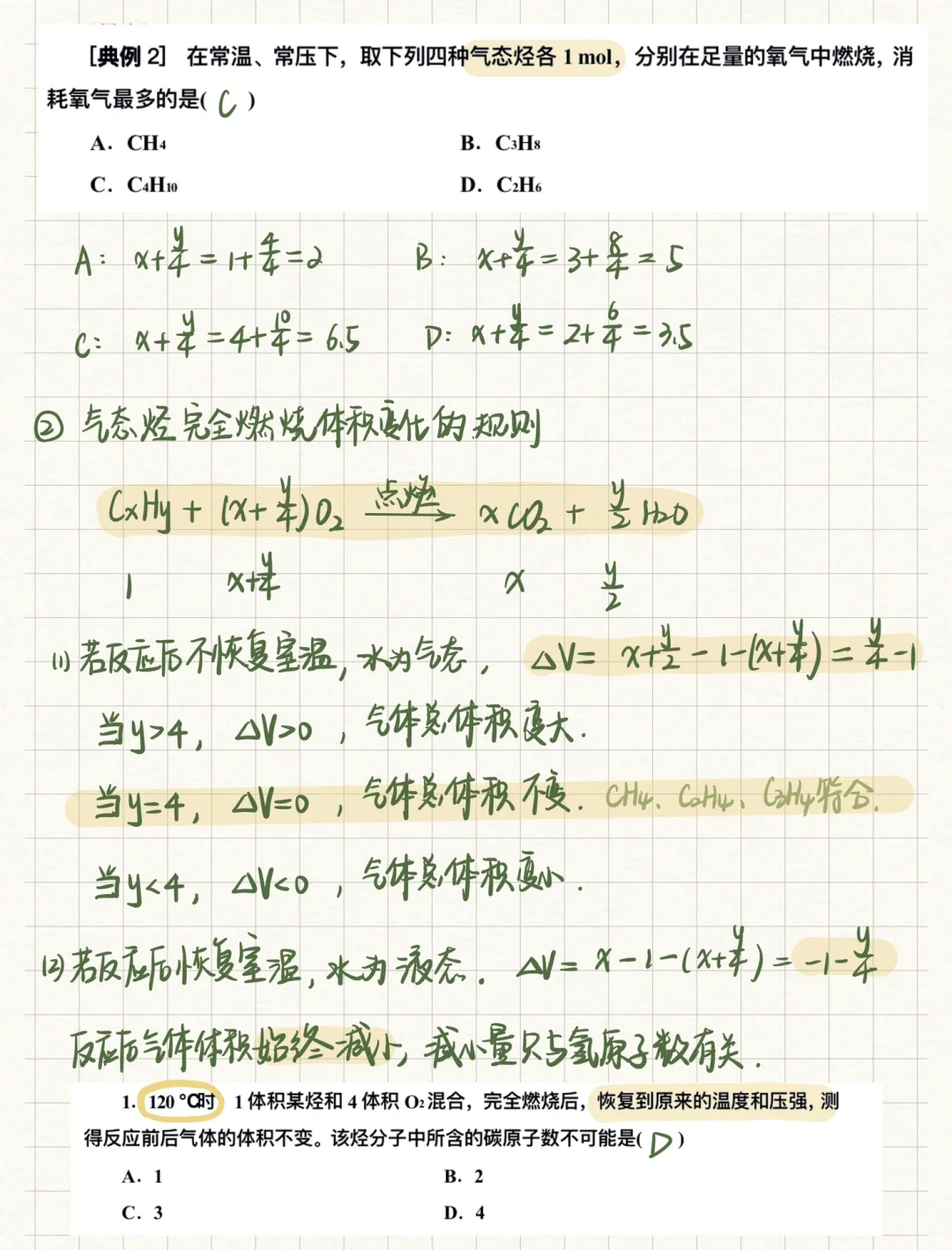 💯新鲜出炉的热乎笔记,非常详细的烷烃性质总结,重点要记住烷烃的取代反应的方程式和现象 💯大家一定要关注本节课的考题方向,烷烃燃烧的规律总结、燃烧后体积变化、一氯代物二氯代物的找法都给大家总结好啦‼️赶快理解+例题练起来