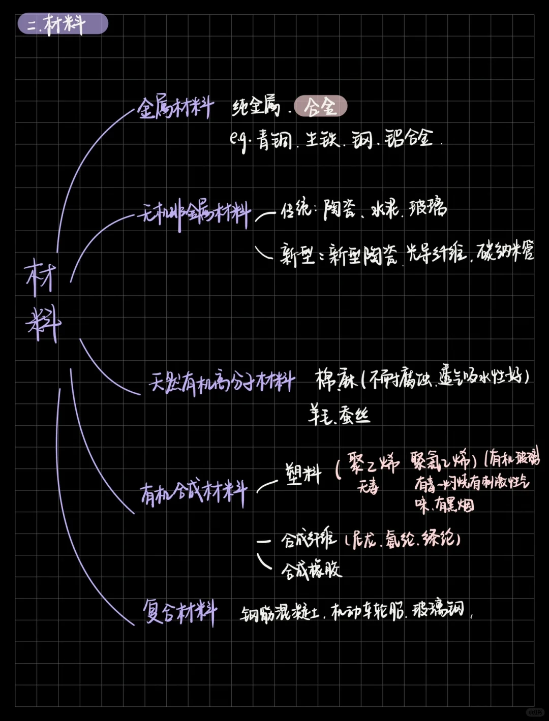 👉无论是哪个版本的同学们,都应该学到材料的相关部分 👉所以本篇笔记用图示形式给大家总结了一下各种材料的分类情况,方便大家记忆 👉其中金属材料、非金属材料、天然有机高分子材料、合成材料、复合材料是我答题时常常填写的名称