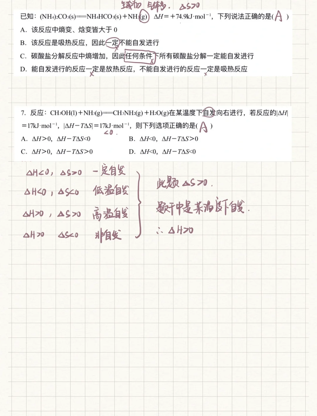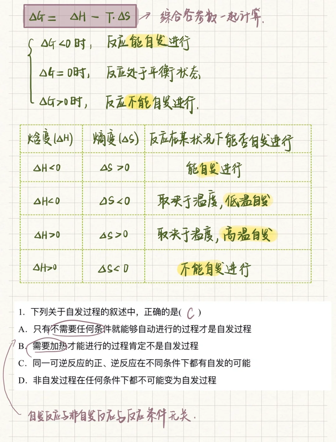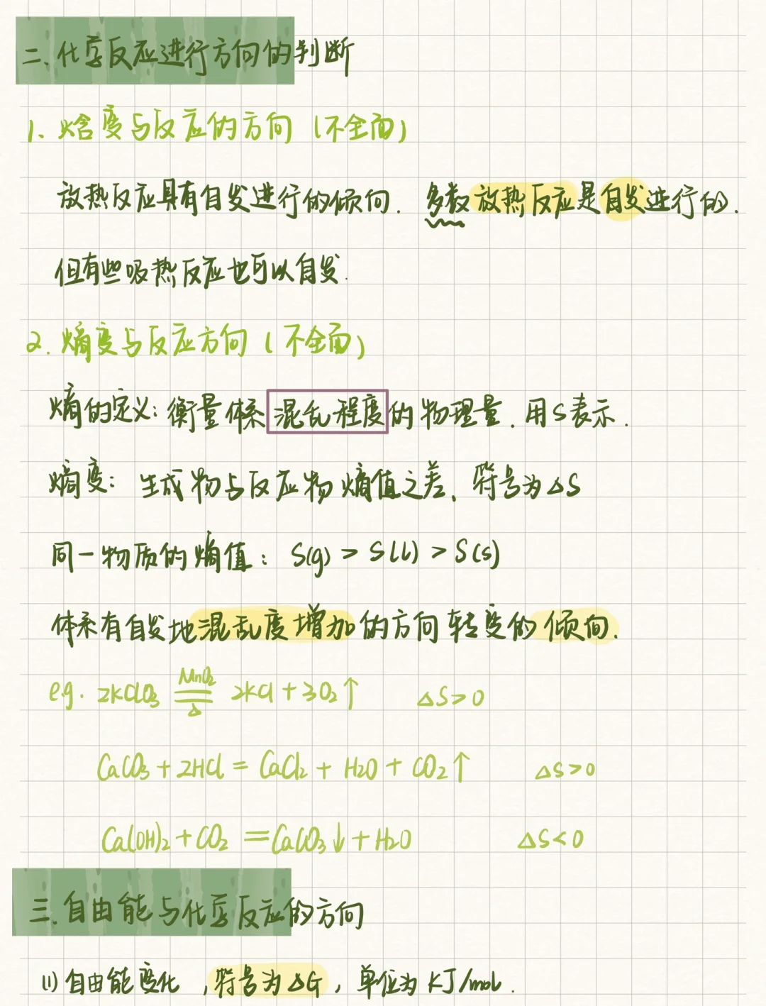💯📝化学笔记新鲜出炉‼️‼️之前太忙啦没太多时间更新💯这个星期开始加油更新‼️❤️ 💯本节课是化学反应方向,主要是判断化学反应是否可以自发进行 💯影响因素有焓变、熵变、温度,串联起来可以形成一个公式判断,这节课把自由能公式背好就OK