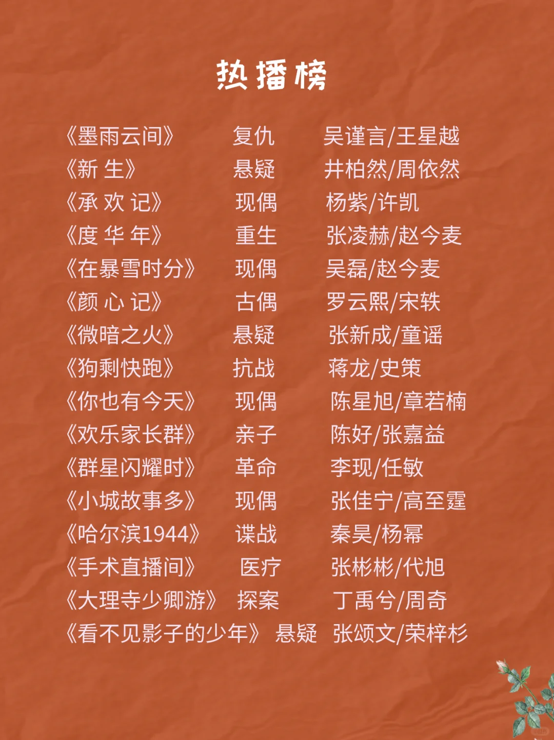 🍑《我的阿勒泰》 山林湖泊间藏着无尽的浪漫与美妙。 草原毡房中的烟火气,真挚纯真的情感,以及如诗如画的风景,令人沉醉其中,又心向往之。 . 🍊《天行健》 险些错过的冷门宝藏剧,剧本很扎实,台词有厚度,故事有深意。 人物立体饱满,多线交织并行,情节环环相扣,节奏张弛有度,吸引力十足。 寻宝的外衣,内里却是拯救家国的大义之心,天行健,世人当以自强不息。 . 🌸《繁花》 教科书级别的美学示范,无论是光影、构图、运镜、调色,还是置景与配乐,甚至海报设计上都展现着精心与细致。 . 🪁《追风者》 历史的坐标上,始终不变的是奋斗者的身姿。 魏若来是:吾爱吾师吾更爱真理;沈近真是:为信仰千千万万遍;沈图南同样是:苟.利国家,生死以之! 时代的轮替中,始终清晰的是追风者的步伐。 . 🥝《大王别慌张》 职场生态的大型还原现场,打工人的真相,社畜们的嘴替,荒诞、奇葩、很反讽。所以,上班而已,别太内耗。 . 🍎《庆余年》 轻喜的形式,悲愤的底色,平权的内核。 故事中有丑恶的心,亦有温暖的情;有悲哀的命运,亦有振奋人心的时刻。 现实或许更残酷,但就钦佩他满腔热血地、倔强又带着疯劲儿的正义感,无畏道阻且长,始终步履不停。 就像金斯伯格所说:“平等就像自由一样,必须由每一代人去争取,且斗争永远不会结束。” . 🥭《春色寄情人》 CP适配感拉满,暧昧时期的拉扯,情到浓时的缱倦,乐而不淫,哀而不伤,恰到好处。 . 🍌《新生》 谎话连篇,叹为观止。 . 🍅《与凤行》 改编后的成品比原著精彩,剧情在忠实原文的基础上,丰富了许多细节,圆融了不足之处,风格颇具喜感,人物刻画更鲜活,特.效也很用心,是一部有质保的仙侠剧。 . 🌸《惜花芷》 落败家族齐心协力搞事业,不雌竞的女性群像,纵使疾风起,人生不言弃。 . 🌹《玫瑰的故事》 尽力去爱是勇气,敢于放手是洒脱,悦己的人生才快意。 . 🥒《执笔》 鉴茶水平一级系数的反骨女主,与腹黑超不过三分钟的比熊系男主,化学反应很奇妙。