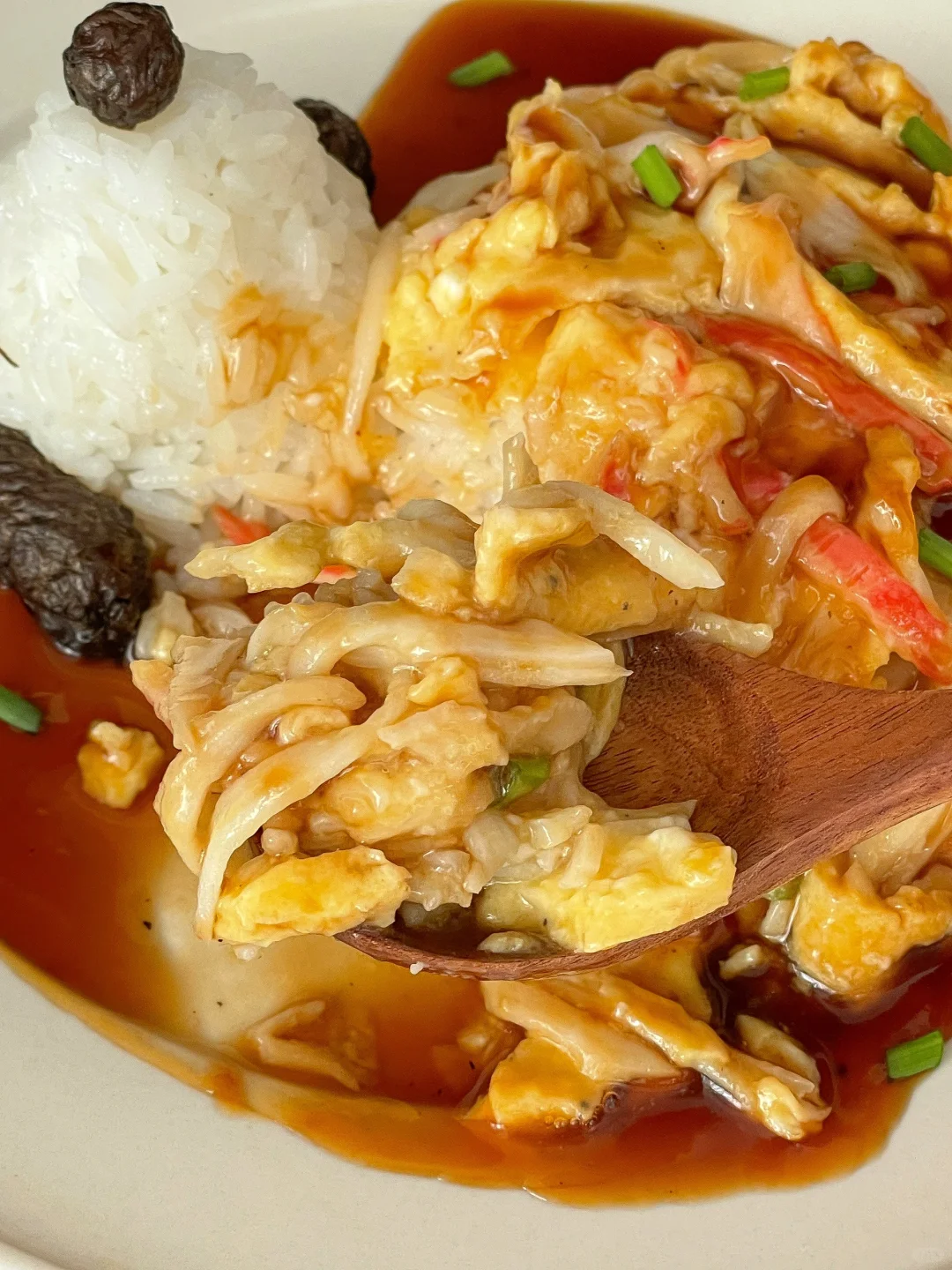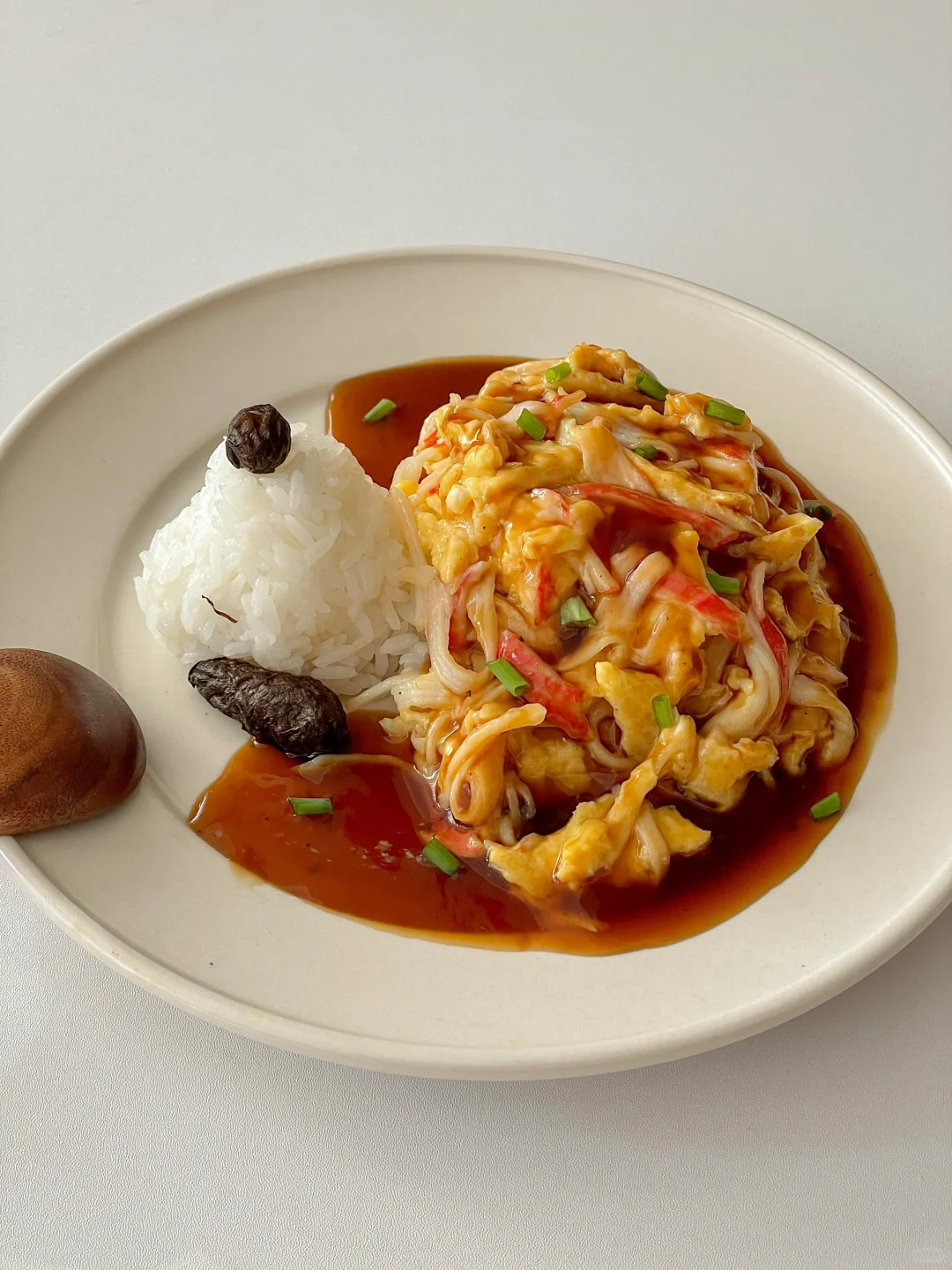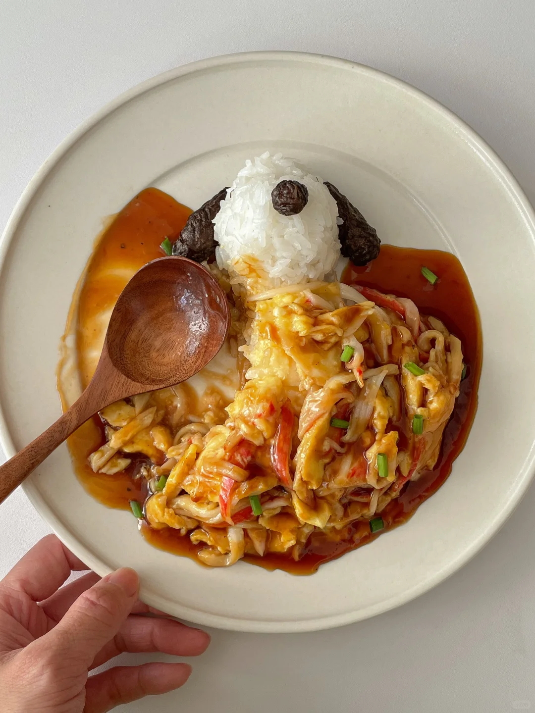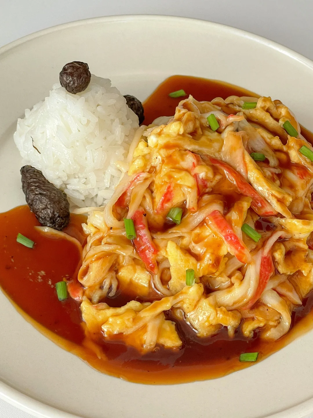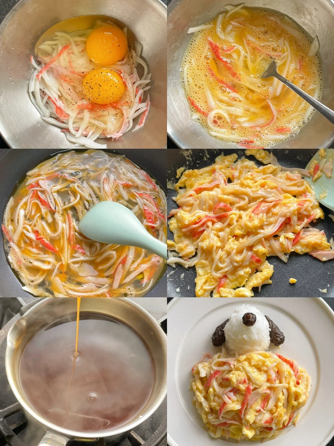 今天做一份乖乖的史努比盖饭吃 每口饭都裹着酱汁和满满的蟹柳蛋 一口又一口 就停不下来! - 材料:鸡蛋3个、蟹柳一份、葱花、米饭 酱汁:生抽一大勺、米醋一小勺、蚝油一小勺、白糖一勺、盐、白胡椒粉、玉米淀粉、清水一大勺 做法: 1️⃣提前把米饭做成史努比的样子 2️⃣蟹柳撕碎,加入鸡蛋打散,可以适量加点盐和黑胡椒调个底味 3️⃣热锅冷油倒入蛋液,开中小火煎到锅里没有生蛋液 4️⃣酱汁里的材料混合搅拌均匀,倒入锅里煮开煮到收汁 5️⃣把做好的蟹柳蛋盖在米饭上,淋上酱汁撒上葱花就可以啦