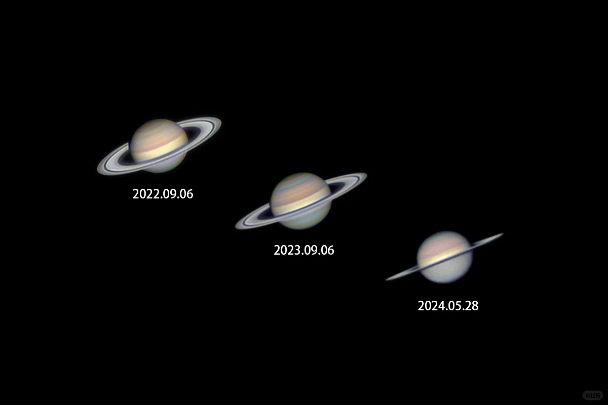 2022-2024 这三年来土星的变化,光环越来越扁平,即将与地球完全平行(2025年3月光环讲不可见)。巧合的是前两年最佳土星拍摄于同一日期,希望今年9.6 也有好天气。拍摄设备: C8hd,x2barlow,Player One Saturn-C 533,EM31pro。8000帧x15%叠加x4段修自转。