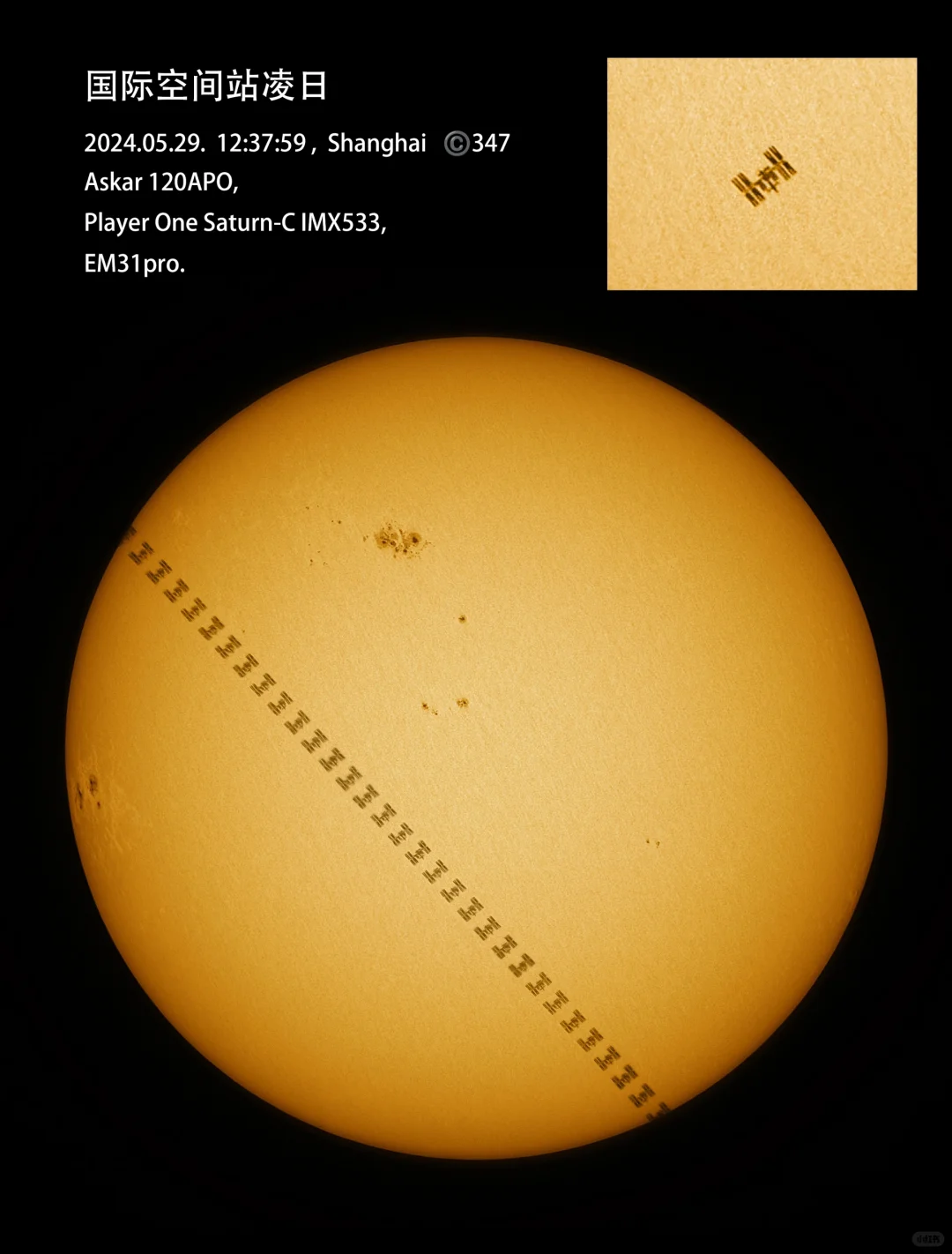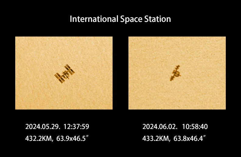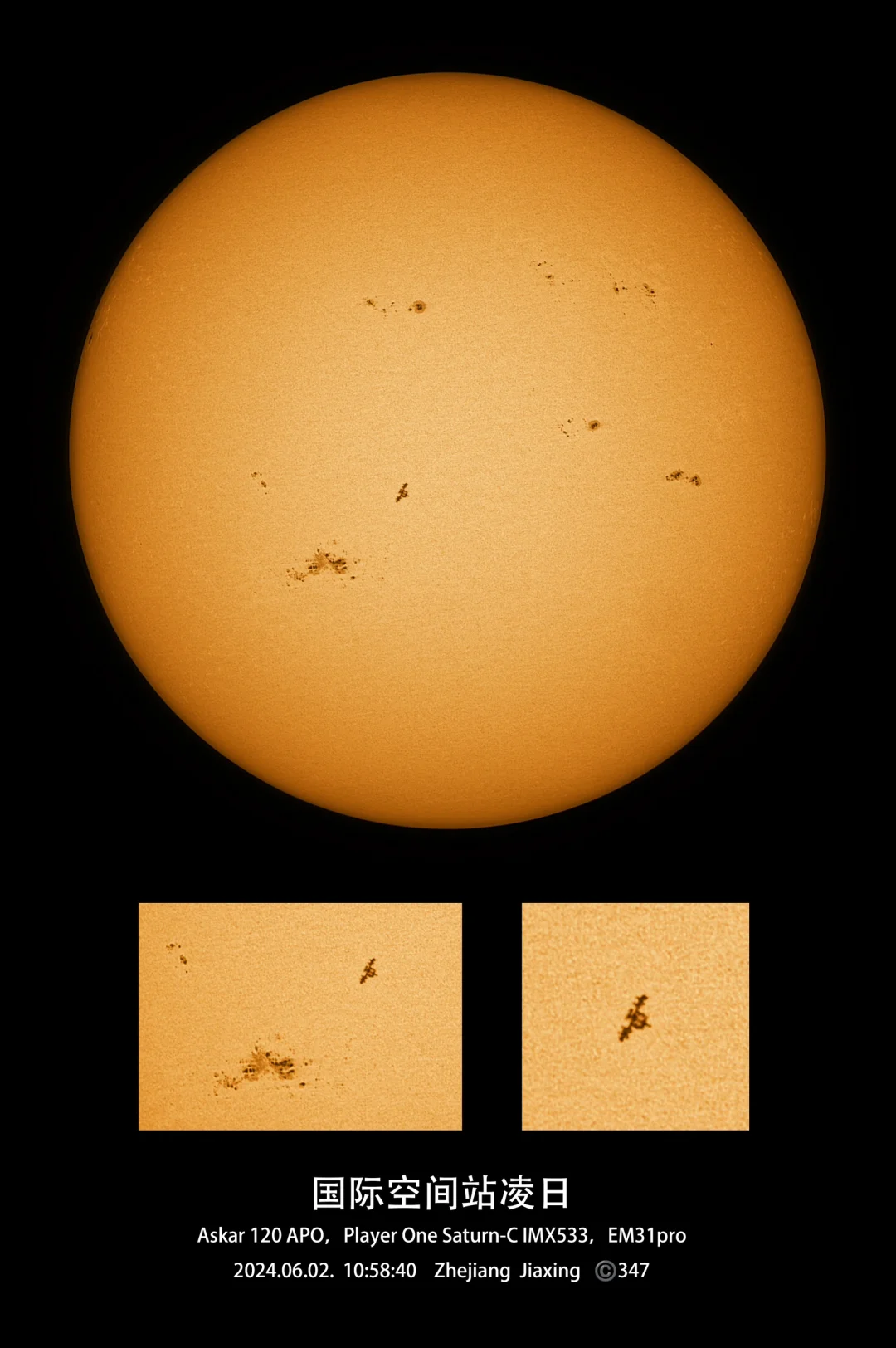 5天内2次拍摄国际空间站凌日,都有云层干扰,但总体还算满意,空间站比较清晰,两次的角度姿态很不一样。
