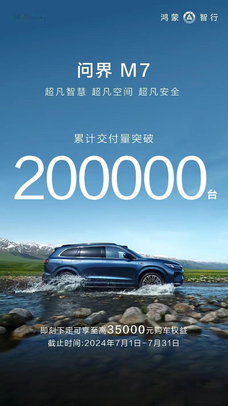 【AITO问界汽车第40万辆将于7月28日下线 又一里程碑】我们从官方渠道获悉,AITO问界汽车将于7月28日,在位于重庆的赛力斯汽车超级工厂举办AITO问界汽车第40万辆新车下线仪式。 作为旗下主销车型,7月24日,鸿蒙智行公布了问界M7 最新交付数据,累计交付突破了20万辆。此外官方还宣布,即刻下定可享至高35000元购车权益,有效期为2024年7月1日-7月31日。【来自懂车帝车友圈】
