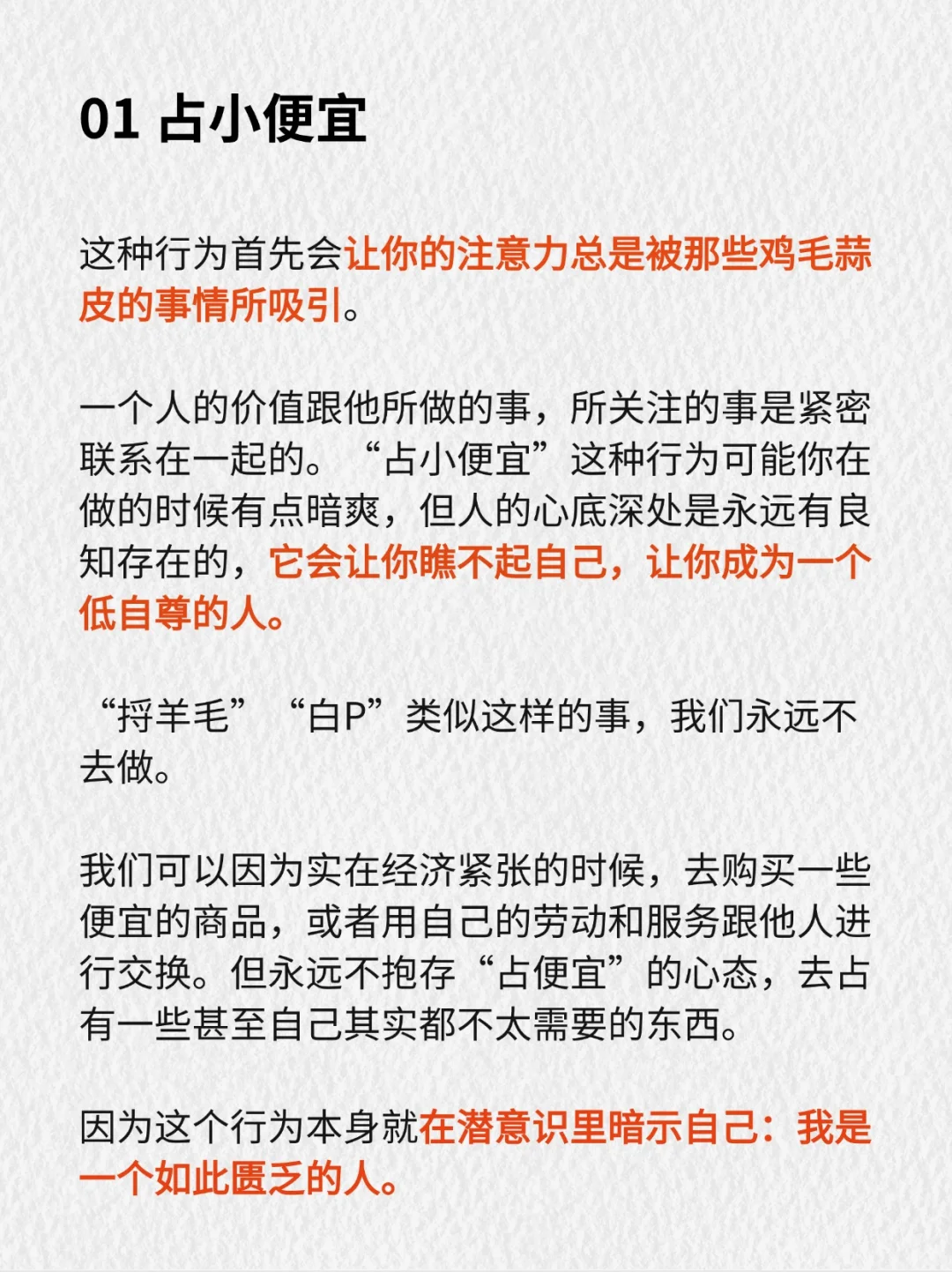 一个人的价值跟他所做的事,所关注的事是紧密联系在一起的。“占小便宜”这种行为可能你在做的时候有点暗爽,但人的心底深处是永远有良知存在的,它会让你瞧不起自己,让你成为一个低自尊的人。