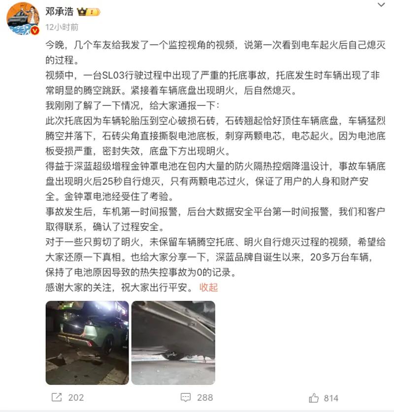 【邓承浩;发布SL03过火说明 石砖尖角撕裂电池底板刺穿两颗电芯】日前,深蓝汽车CEO针对SL03行驶过程中出现了严重的托底事故,托底发生时车辆出现了非常明显的腾空跳跃。紧接着车辆底盘出现明火,后自然熄灭发布了过火说明。 邓承浩表示,此次托底因为车辆轮胎压到空心破损石砖,石砖翘起恰好顶住车辆底盘,车辆猛烈腾空并落下,石砖尖角直接撕裂电池底板,刺穿两颗电芯,电芯起火。因为电池底板受损严重,密封失效,底盘下方出现明火。 得益于深蓝超级增程金钟罩电池在包内大量的防火隔热控烟降温设计,事故车辆底盘出现明火后25秒自行熄灭,只有两颗电芯过火,保证了用户的人身和财产安全。金钟罩电池经受住了考验。 事故发生后,车机第一时间报警,后台大数据安全平台第一时间报警,我们和客户取得联系,确认了过程安全。 对于一些只剪切了明火,未保留车辆腾空托底、明火自行熄灭过程的视频,希望给大家还原一下真相。也给大家分享一下,深蓝品牌自诞生以来,20多万台车辆,保持了电池原因导致的热失控事故为“零”的记录。【来自懂车帝车友圈】