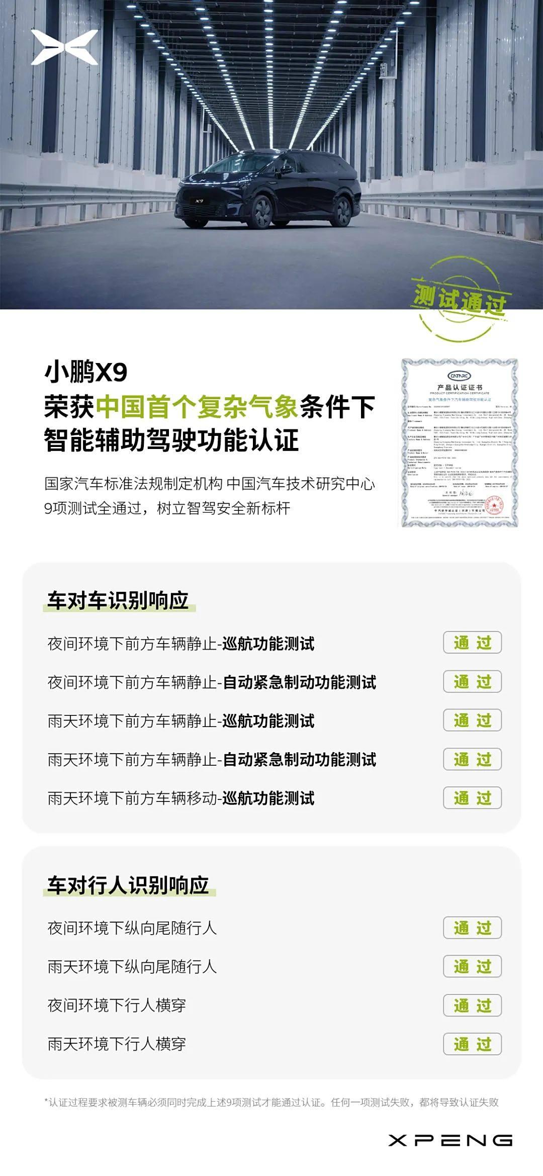 【小鹏X9完成复杂气象条件下辅助驾驶认证】近日,小鹏X9在中国汽车技术研究中心有限公司(简称“中汽中心”)成功完成了复杂气象条件下的汽车辅助驾驶功能认证。小鹏X9以9项测试全面通过的成绩,顺利获得认证证书,成为全国范围内首个通过此项测试的车型。   日常驾车过程中,特别是在夜间漆黑小路、雨雾天、隧道强光、暗光等视野受限的环境中行车,若不能及时有效判断周围环境,很容易因视野盲区引发交通事故。此时,智能驾驶辅助系统便发挥了关键作用,能帮助车辆快速识别并响应。   中汽中心广州检验中心的此次测试专门针对黑夜、雨雾天等复杂气象条件,对车辆的智能辅助驾驶安全功能进行全面考验,以评估其可靠性和安全性。本次测试涵盖了黑夜和雨天两大复杂环境,涉及车对车的识别与响应以及车对人的识别与响应,总计9项测试。即在雨天和黑夜的复杂条件下,分别测试小鹏X9对移动前车和静止前车的识别响应,以及小鹏X9对纵向尾随行人和行人横穿的识别和响应。   小鹏X9搭载了XNGP全场景智能辅助驾驶系统,全车配备了包括前向双激光雷达、摄像头、毫米波雷达、超声波雷达等29个智能驾驶感知元件。凭借XNet深度视觉神经网络,它实现了更强的环境感知能力。配合双Orin-X芯片,整个智能辅助驾驶系统能够更快速地做出决策。目前,最新5.2.0版本已实现端到端大模型全面上车,可适应包括掉头、环岛及狭窄小路等在内的复杂路况。【来自懂车帝车友圈】