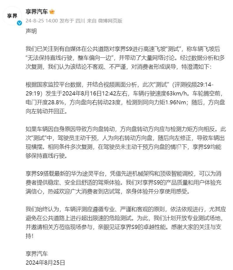 【官方回应享界S9高速飞坡风波:驾驶员主动干预导致车辆横摆】针对近期网络热议的享界S9高速飞坡“测试”,享界汽车于8月25日发布声明,我们已关注到有自媒体在公共道路对享界S9进行高速飞坡“测试”,称车辆飞坡后“无法保持直线行驶,整车偏向一边”,并带动了大量网络讨论。经过数据分析和多次复测,我们认为该结论不客观、不严谨,对消费者形成误导,特澄清如下: 根据国家监控平台数据,并结合视频画面分析,此次“测试”(评测视频29:14-29:19)发生于2024年8月16日12:42左右,车辆行驶速度63km/h。车轮腾空前,电门开度28.8%,方向盘向右转动23度,检测到同向力矩1.96Nm;随后,方向盘向左转动并回正。 如果车辆因自身原因导致方向盘转动,方向盘转动方向应与检测力矩方向相反。此次“测试”中,驾驶员主动干预,人为向右转动方向盘,随后向左修正,导致车辆出现横摆。相同条件多次复测,在驾驶员未主动干预方向盘的情况下,享界S9均能够保持直线行驶。 享界S9搭载最新的华为途灵平台,凭借先进机械架构和顶级智能调校,可以为消费者提供稳定、安全且舒适的驾乘体验。我们对享界S9的产品质量和用户体验充满信心,热诚欢迎广大消费者到店试驾,亲身体验并分享使用感受。 我们始终认为,车辆评测应遵循专业、严谨和客观的原则,依法依规进行,尤其应避免在公共道路上进行超出限速的危险测试。为此,我们计划开放专业测试场地,并邀请相关方莅临现场参与,亲眼见证享界S9的卓越性能。感谢大家的关注与支持!【来自懂车帝车友圈】