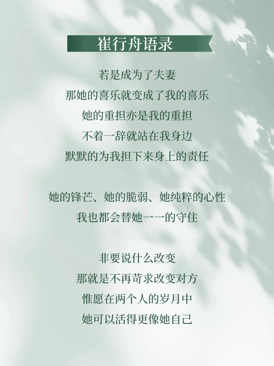 崔行舟:若是成为了夫妻,那她的喜乐就变成了我的喜乐;她的重担亦是我的重担;不着一辞就站在了我身边,默默的为我担下来身上的责任。