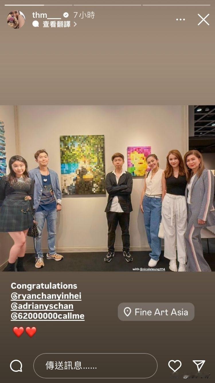 乐小姐公子参加艺术展「东张女神」获钦点捧场 一动作证地位不同 TVB高层乐小姐乐易玲有两位公子陈衍丞(Adrian)和陈彦义(Ryan)。充满艺术细胞的Adrian偏好艺术画作创作,从其个人IG上亦不难看到他的作品。早前他的作品更曾被摆放在伦敦的一间艺术展览中心,而近日Fine Art Asia在香港展出期间,Adrian的画作亦在展览中展出。 从Adrian的IG Story上看到,不少TVB艺人都有捧场去支持,更齐齐拍下画作在自己的IG Stoey开心share。不过,唯独是一位近年人气急升的「东张女神」邓凯文(Eris)「荣获」与乐小姐及两位公子站在画作前合照的机会,更获得Adrian亲自转发!一睇就知地位零舍唔同啦!