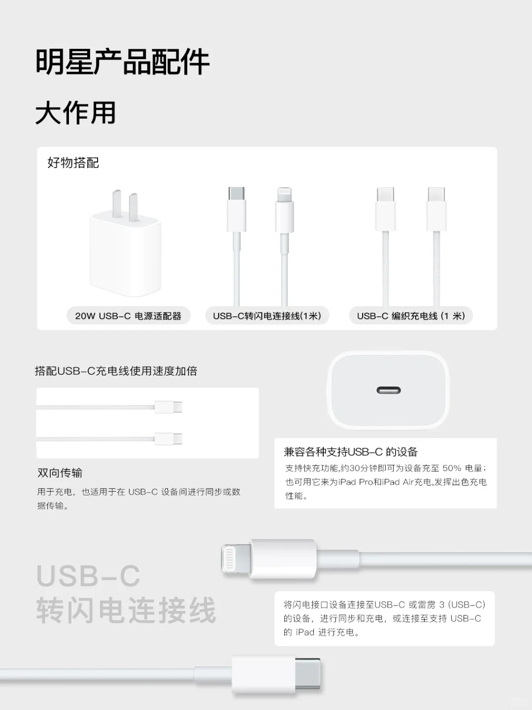 20W USB-C电源适配器:20W充电器外观小巧玲珑便于携带,搭配上USB-C转闪电连接线即可为iPhone、iPad等苹果设备快速充电。