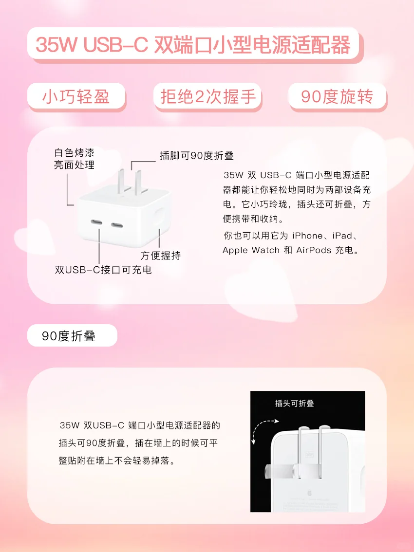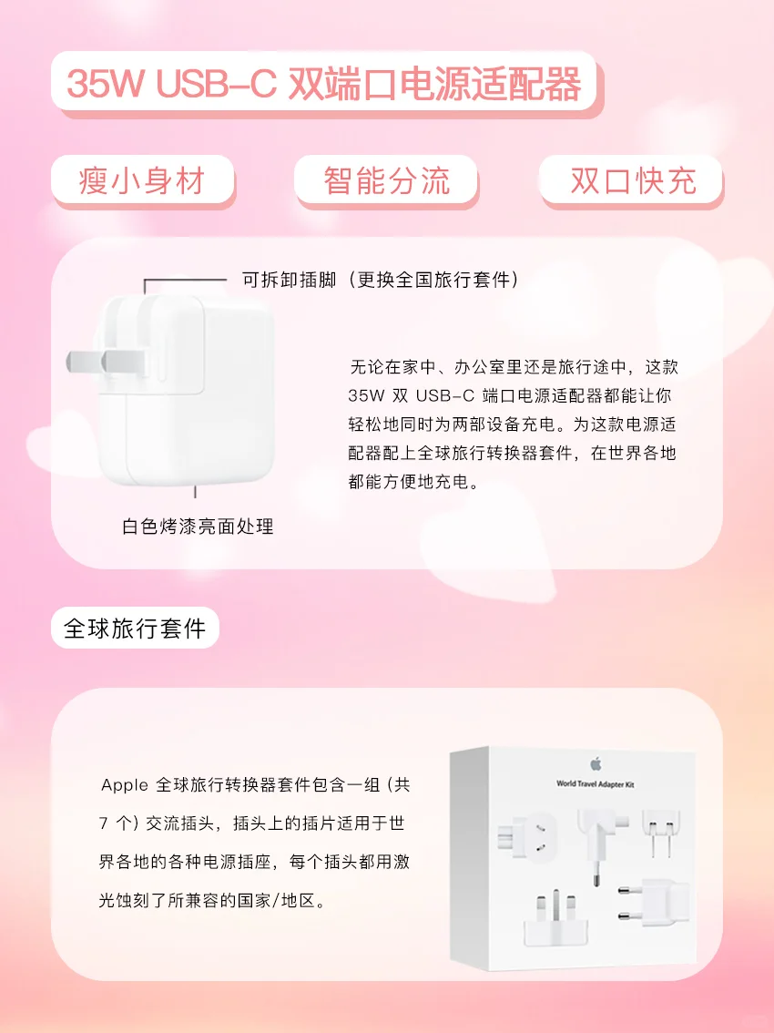 感恩有你,一路相伴!在旅行的同时配备上35W双USB-C端口电源适配器,会有你想不到的惊喜!双口快充,充电满满,爱意暖暖”