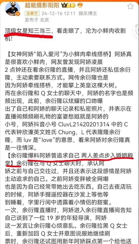 12月16日,知名娱记在社交平台发文,揭晓预告大瓜顶流女星知三当的答案,当提到女主角名字的时候,所有网友都非常惊讶,都猜错了,万万没想到,会是阿娇。 娱记还晒出聊天记录,爆料阿娇对这个小鲜肉非常上心,熬夜看直播,男方一阵炫耀,还晒出与阿娇的私密照。 关键一点,阿娇主动追男方,两人还差点走入婚姻的殿堂。 说实话,真的没想到,阿娇也算知名艺人,竟然对一个网红付出真感情,有点难以理解,就算经历过失败的婚姻,也不该将就,男方能晒出聊天记录和私密照炫耀,人品让人担忧。 当然,娱记的爆料未必可信,希望大家理性吃瓜,还是等待当事人的回应吧!