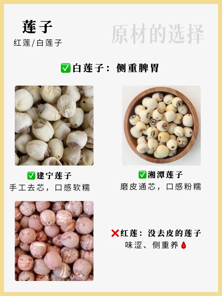 3️⃣莲子:以湘潭莲子或建宁产的莲子为佳。建宁莲子煮后更软糯,湘潭莲子生吃都香甜,选择磨皮去芯的白莲子。未磨皮的红莲子性味偏涩,用于🩸虚情况。