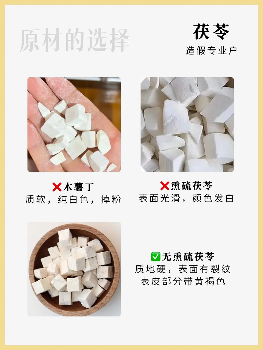 2️⃣茯苓:以产自云南的茯苓为佳,不熏硫的茯苓切面有裂纹、颜色淡白色。质地硬,泡水或煮水后,可以捏散。
