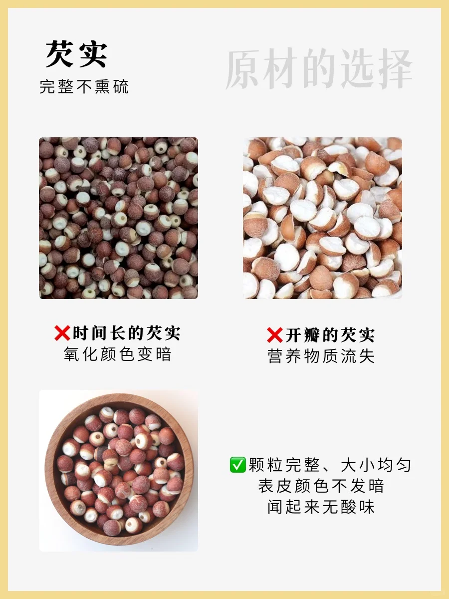 4️⃣芡实:以肇庆产的芡实为佳,选择饱满红润的芡实,开瓣的芡实较好煮透但是营养物质容易流失。