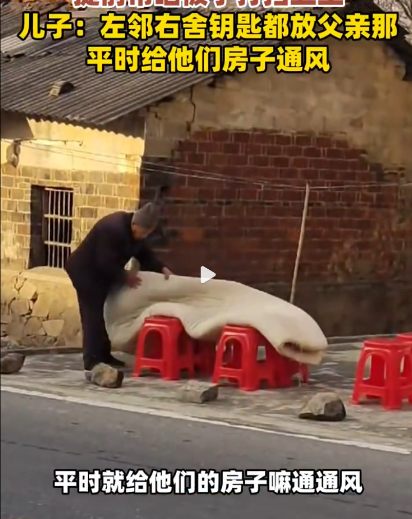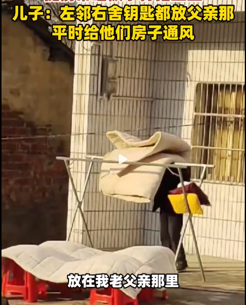 安徽安庆。一位86岁的老人得知打工邻居即将回家过年,主动帮忙晾晒被子、打扫卫生。老人的儿子透露,左邻右舍的钥匙都放心地交给父亲保管,展现了邻里间深厚的情谊与信任。