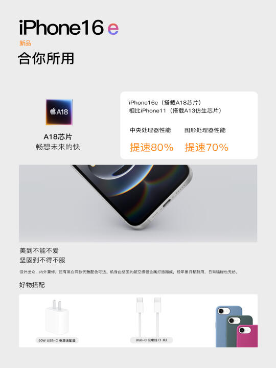 芯片:iPhone 16e搭载了A18芯片,与iPhone 16相同,但GPU为4核。