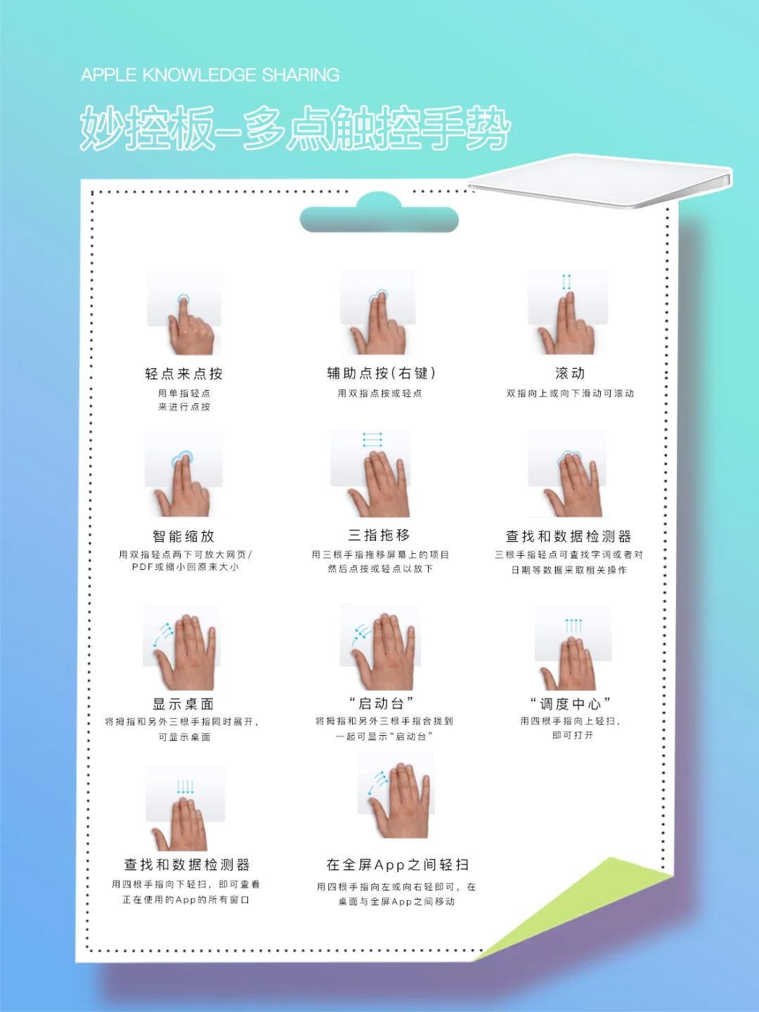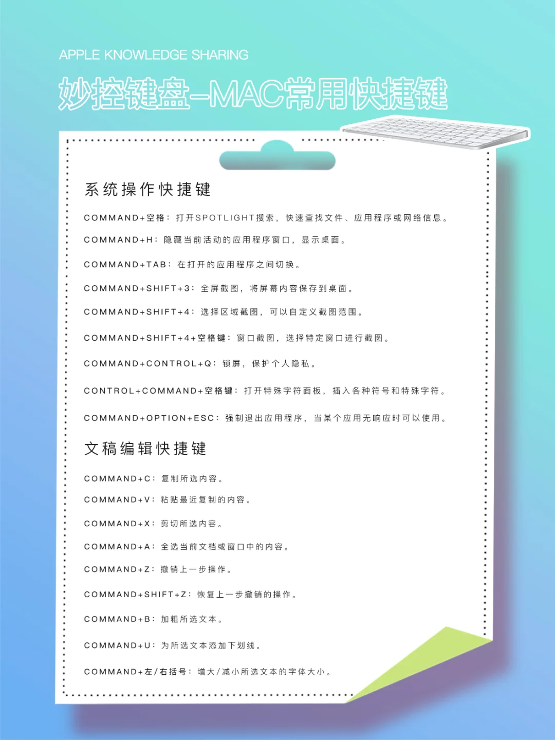 1.我整理了一份苹果妙控键盘在Mac上常用快捷键讲解供大家参考: