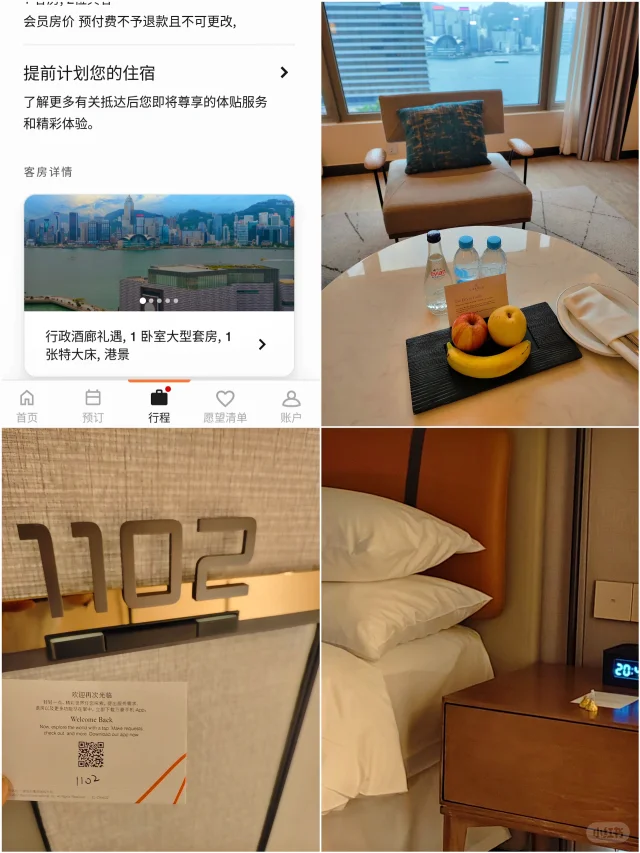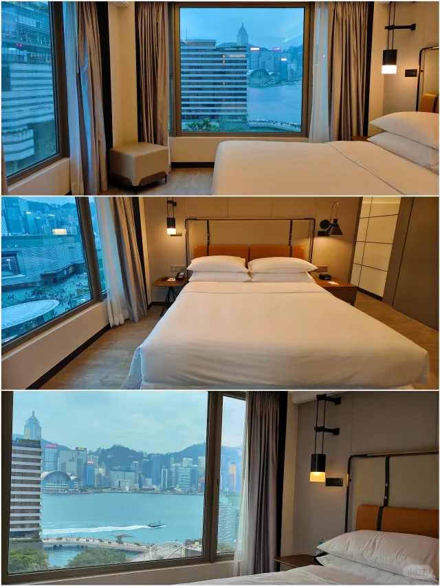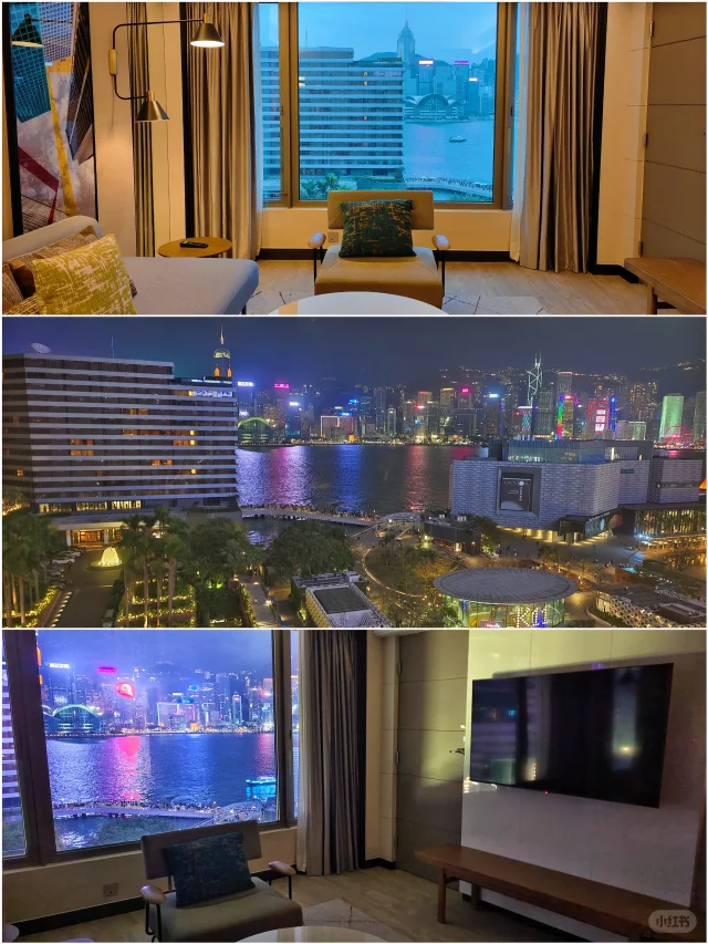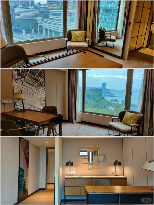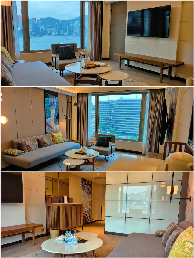 房型升级到了海港景观,1卧室大型套房,房间标称77平方米,在香港已是相当阔卓了,除了客厅、卧室,居然还有单独的书房,每个房间的视野都是一流,直面维多利亚港,白天和夜晚的景色都不错。( P5~P12 )。