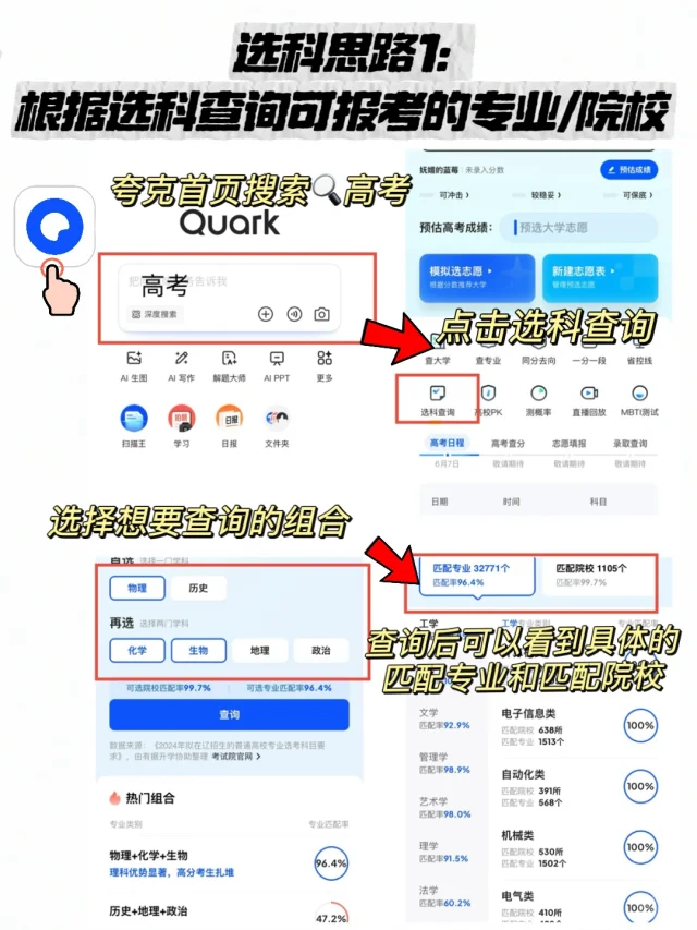 🔍➡️如果宝子们想了解不同选科组合将来能报考哪些院校专业,就可以在夸克上搜索”高考“,里面的选科查询可以查各种选科组合对应的院校专业匹配率,用清晰的数据展示不同选科组合的优势劣势,帮大家快速理清思路,找到适合自己的选择。