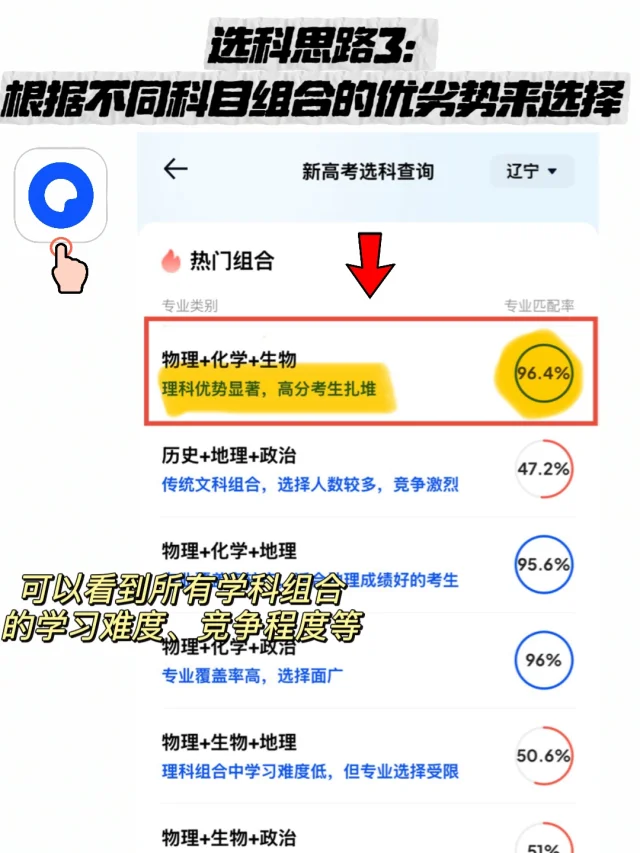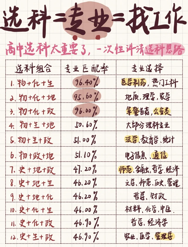 2️⃣从专业院校选择来看:物化生、物化地、物化政组合专业匹配率:96.4%、95.6%、96.0%,这样的物化为前提的组合对专业的匹配度和包容性极大,是唯三匹配大于95%的组合,远超其他,能报考的专业和院校选择非常多