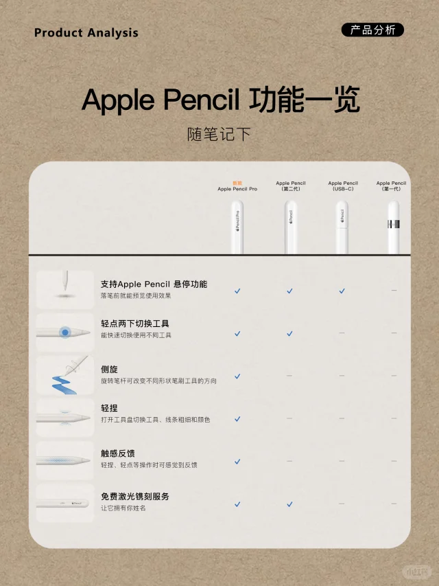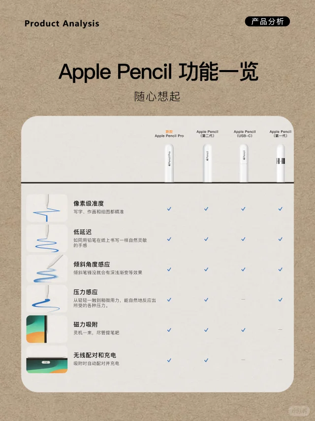 ipad相信很多朋友都有吧,为了提升iPad使用体验,Apple Pencil成为必选配置。截止目前Apple,已经出了4款Apple Pencil,究竟该怎么选呢?快来看看吧!✏Apple Pencil 1代兼容性:适配iPad Pro 12.9英寸(第二代及以下)、iPad Pro 10.5英寸、9.7英寸、iPad Air(第三代)、iPad(第十代及以下)等。特点:通过闪电接口配对和充电,使用时需将笔帽取下与iPad尾插连接。能灵敏感应用笔力度和运笔倾斜角度变化,达到像素级精准度。 ✏Apple Pencil 2代兼容性:适配iPad Pro 12.9英寸(第三代及以上)、iPad Pro 11英寸(第二代及以上)、iPad Air(第四代及以上)、iPad mini(第六代)。特点:可磁力吸附在iPad侧边,方便配对、充电与放置。支持轻点两下手势,无需放下笔就能转换不同工具。 ✏Apple Pencil (USB-C) 兼容性:兼容所有配备USB-C端口的iPad型号,除了 Lightning接口的老款iPad外基本都能用。特点:与iPad连接需通过USB-C线进行配对和充电。缺少压力感应和双击快速切换功能,不推荐绘画爱好者使用。 ✏Apple Pencil Pro 兼容性:适配iPad Pro 13英寸(M4)、iPad Pro 11英寸(M4)、iPad Air 13英寸(M2)、iPad Air 11英寸(M2) 。特点:增加了轻捏、侧旋、触觉反馈等功能,如轻捏可快速切换工具、线条粗细和颜色,侧旋可实现精确控制形状笔刷工具,触觉反馈让操作更有真实感。