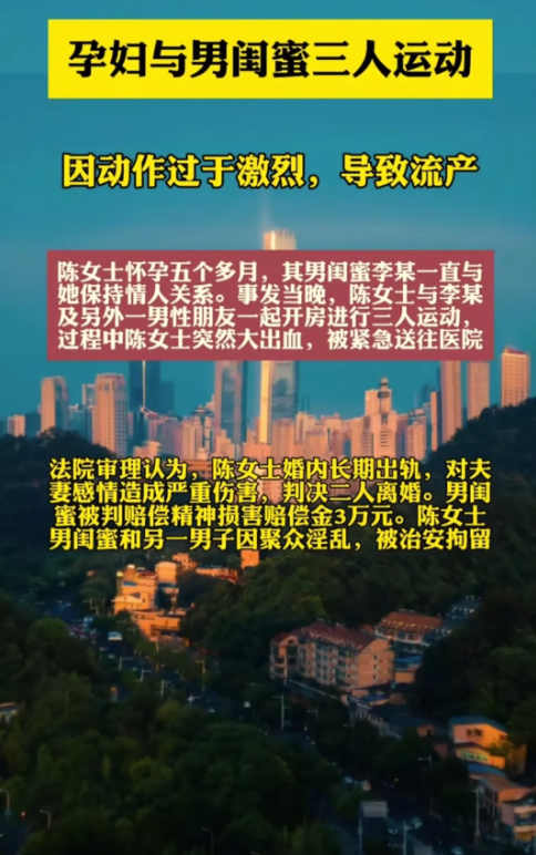 个世界处处都是大瓜 法院审理认为,陈女士婚内长期出轨,对夫妻感情造成严重伤害,判决二人离婚。男闺蜜被判赔偿精神损害赔偿金3万元 陈女士男闺蜜和另一男子因聚众淫乱,被治安拘留