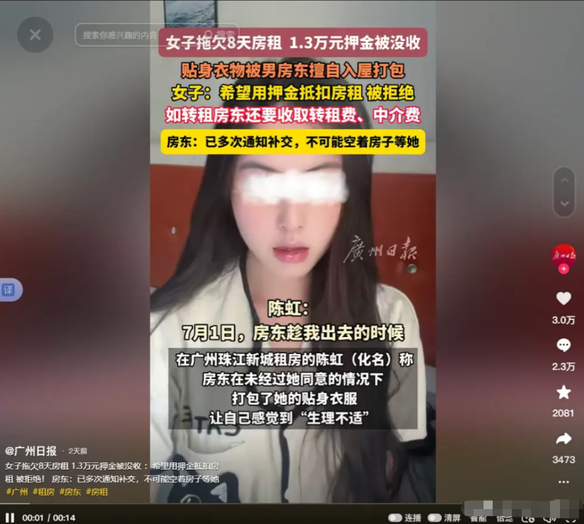 7月12日报道,广东广州,因女租客拖欠8天房租,男房东多次催要未果,扣了女租客13600元押金,还将女租客的行李打包扔在门口。因为内衣、内裤等私人物品也被男房东打包,女租客感觉“生理不适”反欲追究男房东的责任。 根据相关报道,女子外地人到广州打工,租了房东的房子,每个月租金6800元,押二付一。因为当时工作需要,时间上也相对来说非常紧迫,女子没有什么时间继续看新的房子,看了几间房子下来,这间无论是采光方面还是安全方面都更好,所以女子果断支付了租金,成功入住。 一开始都非常顺利,没有任何的问题,与房东之间也没有任何的矛盾,只有收房租的时候会说上两句,东西需要维修房东也会进行解决,没有任何麻烦和问题。 但是在这个月,女子的工作出了一些问题,可以说一直都是月光族的她,没有一点积蓄,没了工作,房租更是供应不上,她没办法,也开启了每天都忙碌的找工作状态,关于下个月得房租也没来得及交,直到交房租时间的隔天,房东打来电话询问情况,女子说出实情,并请求房东宽限一些时间,她也会尽快解决这些问题。 结果15天就这样过去了,女子那边依旧没有任何回应,再一次打电话,女子依旧交不上房租,就想着和房东商量能不能从押金上面扣一个月的房租,房东想都没想,直接毫不犹豫地拒绝了,说完,房东就要挂断电话,女子着急阻止,又提出能否在这个月将房屋进行转租。 这一提议,房东虽然没有直接拒绝,但也表示如果用这种方式来解决问题,那么需要先缴纳一笔转租费和中介费,除此之外,该交的房租还是要交,而且原本按照合约规定,没有违约便会全额退还的租金也不会再退。 女子不明白,好好的协议白纸黑字地写在合同上,现在怎么到了房东这里就变成为所欲为了,女子没理会,依旧住着房子,继续想办法,但是这一天回来的时候,一开门,房子外面就是大包小包,走近一看,塑料袋里面装的全部都是她的东西,再打开衣柜门,里面的衣物也被全部清空,包括女子的贴身衣物。 当场女子就急了,觉得房东这样的方式不对,让自己感觉不被尊重,房东却不以为然,只觉得房子空着就是在浪费自己的资源和时间,是一种浪费,就找了新的租客。帮女子收拾东西,也是尽快让新租客成功入住。 眼见说不通,女子直接起诉了房东,要求房东道歉,并退回押金。房东这边丝毫不为所动,依旧不予归还。 此事曝光后,网友直言:最重要的是未经允许租客同意进入租客房间,这已是犯法行为。疑房东窃取,选择报警,最好的防守就是进攻。还有网友表示:房东也给了缓和时间,毕竟白纸黑字的东西,你既然签了字肯定是认可的,现在产生纠纷,不能全怪房东给。 对此,大家怎么看?