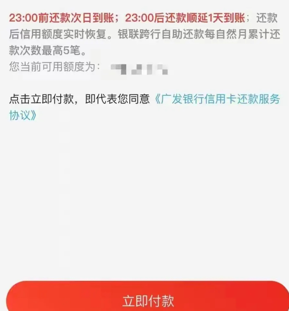 小字显示: 23:00前还款,次日到账;23:00后还款,顺延1天到账;还款后信用额度实时恢复。