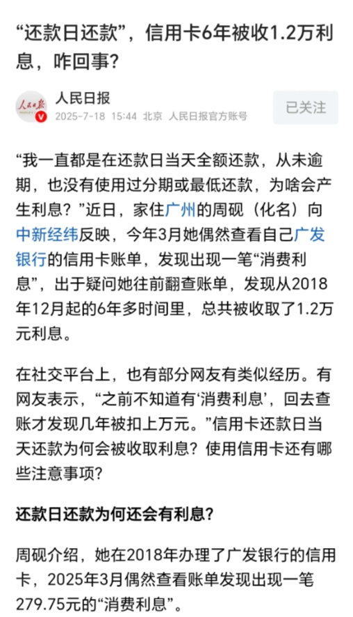 一当又一当,当当不一样!广州,一女子办了张信用卡,每月都在还款日还款,6年之后,女子偶然翻开账单,这才发现,银行一直在收她利息,6年时间扣走她12755.94元,女子联系客服,客服说她没在还款日还款,女子在APP里一看,这才发现,还款页面有一行小字: 今日还款,次日到账,也就是说,在还款日还款,第2天才能到账,这样一来,成了逾期,就会产生利息和违约金,女子大怒,银行从未通知过我,谁能知道会是这样?结果令人意想不到!