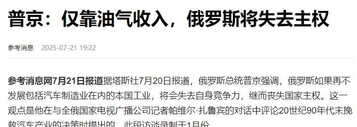 自俄乌冲突爆发以来,俄罗斯身背美西方国家上万条制裁。 可在这样的背景下,俄罗斯非但没有崩溃,还依靠石油和天然气实现逆风翻盘。 然而前不久,普京却表示,仅仅依靠出口石油和天然气,俄罗斯迟早会变成末流国家! 靠卖油卖气过日子,虽然一时爽,但长久看会让俄罗斯越来越落后,最终掉队。 首要问题就是“吃老本”吃不长,路子越走越窄。 俄罗斯现在赚钱主要靠老祖宗留下的石油、天然气和武器。 这跟几十年前的苏联一个样,没啥大变化。 就像一个人一直靠变卖家产过日子,钱总有花完的一天。 现在国际上对它制裁越来越狠,买家少了,价格还被压着,这“家底”不好卖了。 武器出口也因为打仗受影响,市场在变小。 光靠这两样东西吃饭,经济就非常脆弱。 国际市场打个喷嚏(比如油价暴跌),或者别人再卡脖子(制裁),俄罗斯经济就容易感冒发烧。 一条腿走路,肯定不稳当。 其次就是“科技树”没点好,未来没竞争力。 现在全世界都在拼“高科技”,尤其是人工智能、芯片这些代表未来的东西。 这才是强国的新“标配”。 看看美国、中国这些国家,都在疯狂搞研发创新。 俄罗斯在这方面落后了,人才储备、技术积累、产业链条都跟不上趟。 它要是还只顾着挖油卖气,就等于放弃了在“未来赛道”上竞争的机会。 结果就是,俄罗斯只能永远当个“原料供应商”,给那些科技强国提供石油天然气这些“初级产品”。 人家用你的油和气,造出更值钱、更先进的东西,反过来可能还要用高科技卡你的脖子。 这就好比你只能卖木头,别人用你的木头造出精美家具甚至火箭,赚大钱还控制你。 最后就是打仗打醒了,光有“量”不行还得有“质”。 俄乌冲突这场仗,像一面镜子,照出了俄罗斯的“家底”不像想象中那么厚实。 本以为靠人多装备多(“钢铁洪流”)能速战速决,结果打成了消耗战。 现代战争拼的不仅仅是坦克大炮的数量,更要看高科技装备、精确制导、通信电子这些“软实力”。 打仗其实打的是国家的技术能力和经济实力。 西方的严厉封锁,让俄罗斯在战场上补充先进装备、关键零部件变得非常困难。 这深刻说明,没有自己过硬的核心技术,光靠卖资源攒下的钱,在关键时刻买不到真本事,大国地位就虚了。 这场仗让俄罗斯明白,没有技术自主,强国的架子撑不住。 总结起来,只靠卖油卖气,就像躺在金山上睡大觉。 短期看,确实能赚快钱,日子也能过。但长期来看,危害巨大。 普京的反思,说白了就是意识到:光靠“卖祖产”(资源)和“卖肌肉”(军火)的老路子,在科技主导的新时代行不通了。 俄罗斯要想不当“末流国家”,必须狠下心,摆脱“资源依赖症”。 花大力气搞自己的科技创新和产业升级。 虽然躺着卖资源很舒服,但要避免未来被淘汰,再难也得转型。