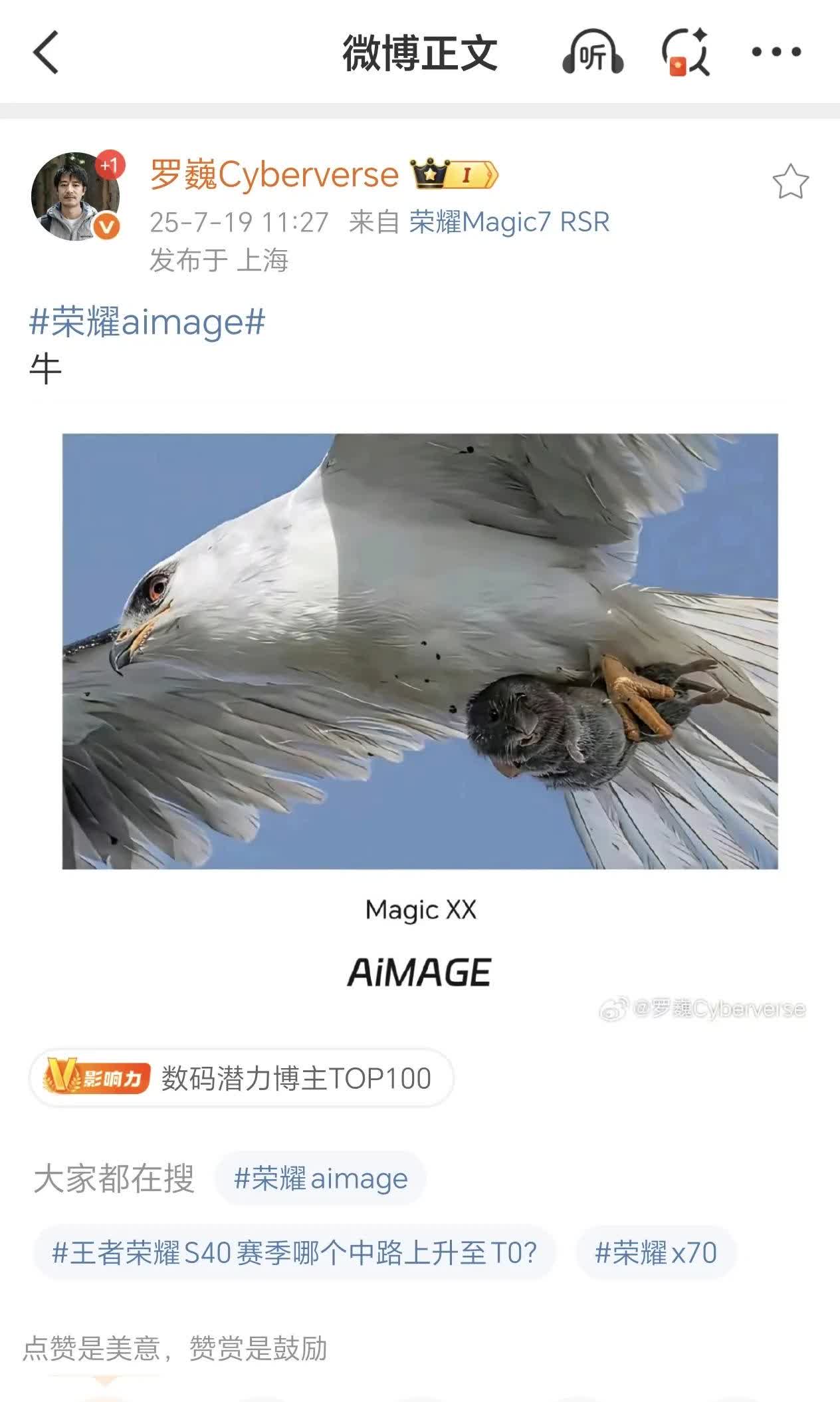 荣耀罗巍:AIMAGE 牛!所以? 荣耀的影像负责人罗巍发了一张老鹰抓着老鼠飞翔的照片,边框备注AIMAGE,看样子下一代荣耀旗舰要发布自家影像品牌了,期待一下!