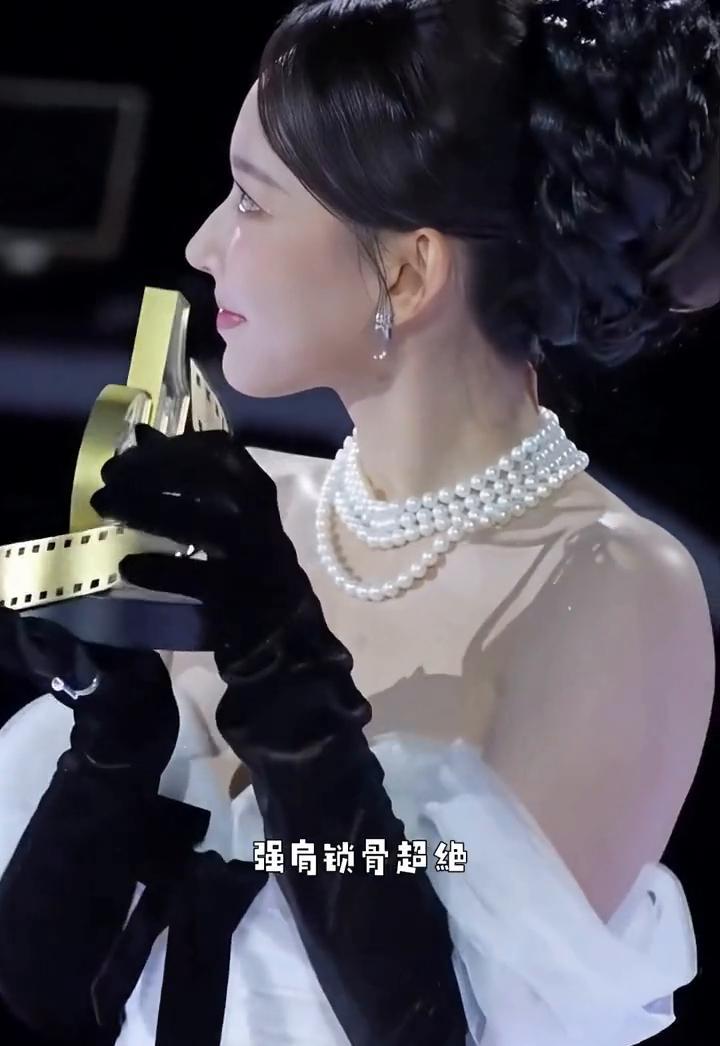 程潇穿白色抹胸裙亮相,强肩锁骨超绝,多层珍珠项链显贵气,黑手套配奖杯,皮肤白到发