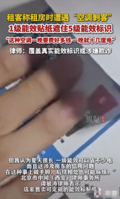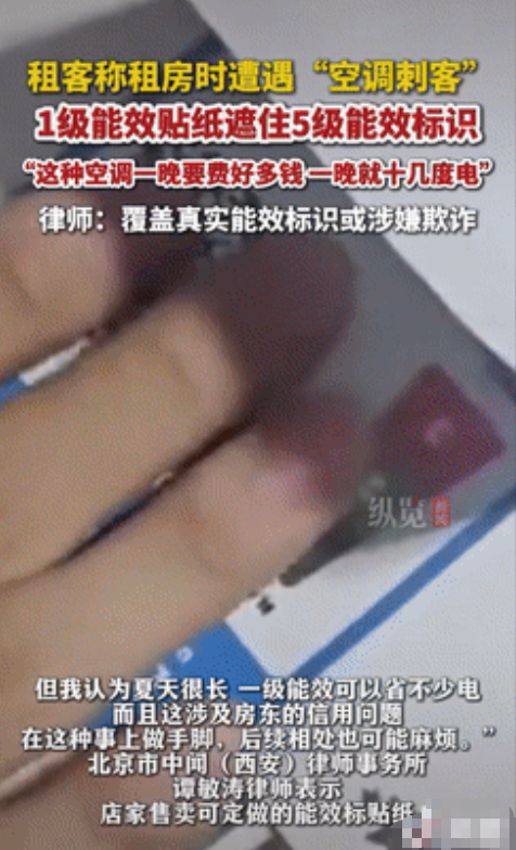 心眼可真坏!四川成都,一女子开空调时,看到能效标识翘了个角,隐约能看到有个红色箭头,心里有点疑惑,就把外层给撕了下来,谁料,竟发现房东用1级能效的贴纸,盖住了原本5级的真标识,女子觉得自己遇到了“空调刺客”! 据纵览新闻7月23日的报道,事情发生在成都,几个月前,女子在某小区租了个房,最近因为天气比较热,就开了空调。 然而,她却发现用电上涨的特别厉害,可空调明明是1级能效,正常来讲,应该是费不了太多电的。 直到后面,她就无意间看到上面的能效标识,竟然分层了,最外面的那个显示的确实是1级,可里面的那个竟是5级能效。 要知道,这一级和五级能效的空调,那用电量能差出一大截,特别是在如今天气特别热的时候,电费开支一下子就上去了。 然而,让女子更为气愤的是,当初签合同的时候,里面根本就没有写具体参数,发现问题后去找房东理论,对方就表示空调新买的,能效就是1级。 也正因如此,就算女子想要维权,都找不到依据,就只能选择吃下这个亏,事情也就不了了之了。 其实类似于这种情况的,并非是特别少见,有些不地道的房东,为了能把房子租出去,就在家电参数上做手脚。 让租户看到家电都是1级的,自然就会有些意动,而大多数人又不会注意细节,等发现问题时往往已经住进去了,想退租都难。 至于如何改变能效标,其实也非常的简单,到网上随便一搜,就能看到有商家能专门制作这东西。 租房子本来就是你情我愿的买卖,用这种欺骗手段实在说不过去,空调费电不费电对租客来说可是实打实的开销,特别是在现在电费不便宜的情况下。 要说这事该怎么防范,租客在看房时就得多个心眼,检查家电不能光看外表,得仔细看看各项标识是不是原装的。 签合同前要把重要家电的型号、参数都写清楚,别光听房东嘴上说,万一真遇到这种事,记得第一时间拍照留证。 虽然不一定能讨回公道,但至少能让更多人知道这种骗局,尤其是现在天气越来越热,那就更加需要注意了。 信息来源:纵览新闻 《租房遭遇“空调刺客”,用1级能效贴纸遮住5级标识。》2025-7-23